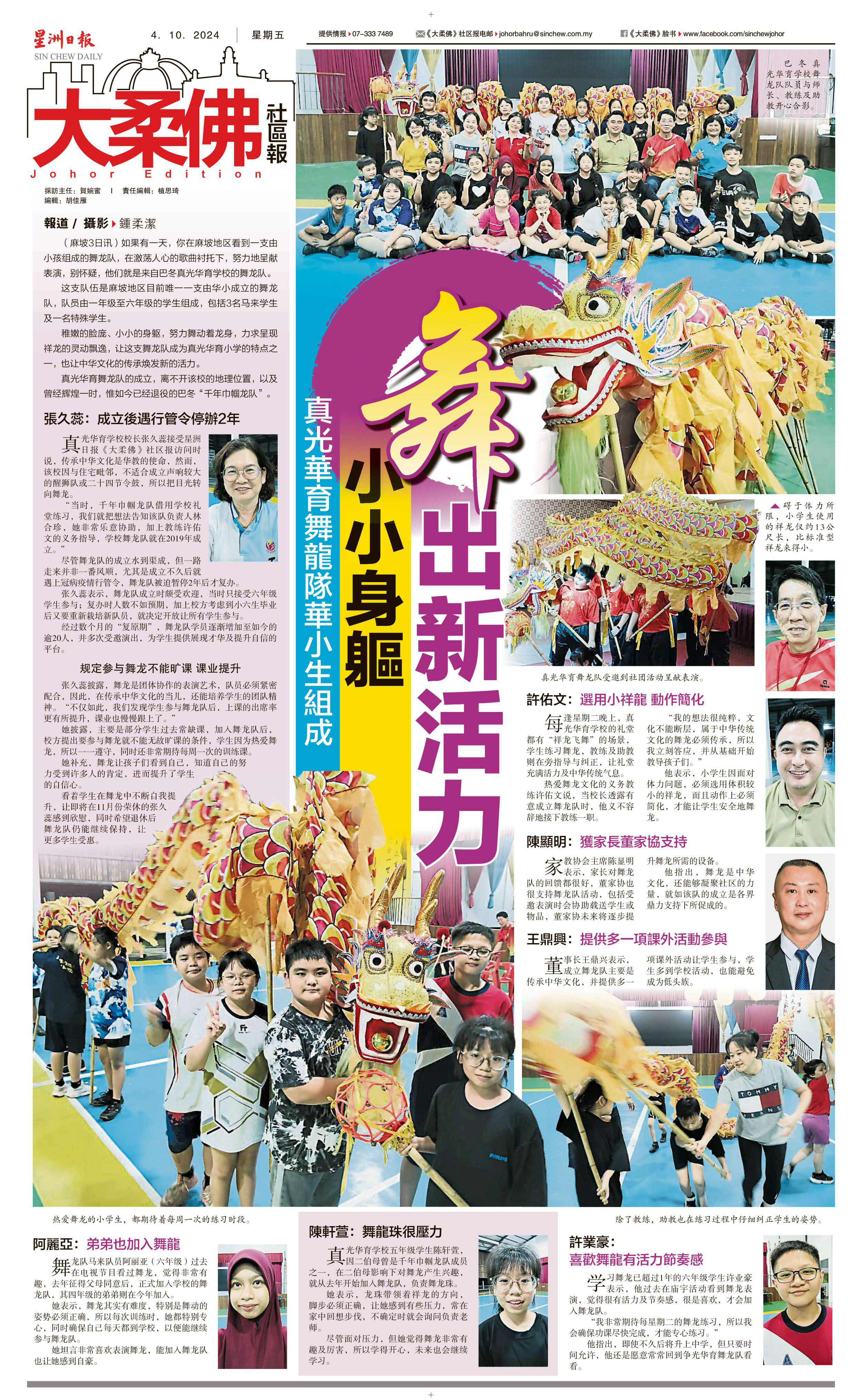 真光华育舞龙队华小生组成 小小身躯舞出新活力 WhatsApp 上一篇文章: 知甘峇都平民华小 进出校长室不用怕 我的学校我的家 上一页 下一篇文章: 史上首例 1华小34教师调职 柔11华小134教师“大洗牌” 下一页