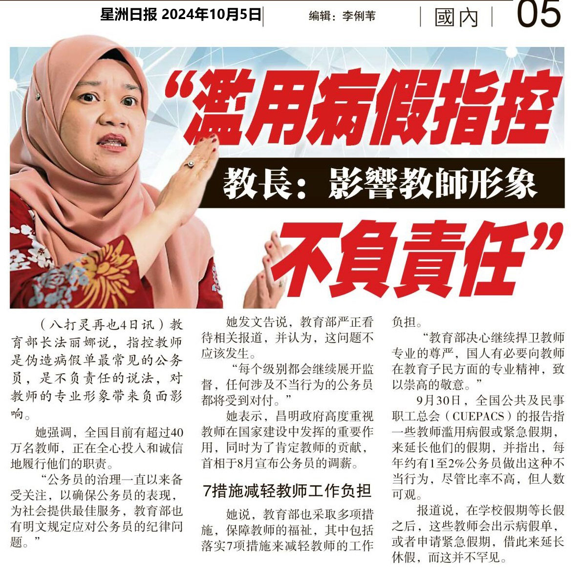 “滥用病假指控不负责任” 教长:影响教师形象