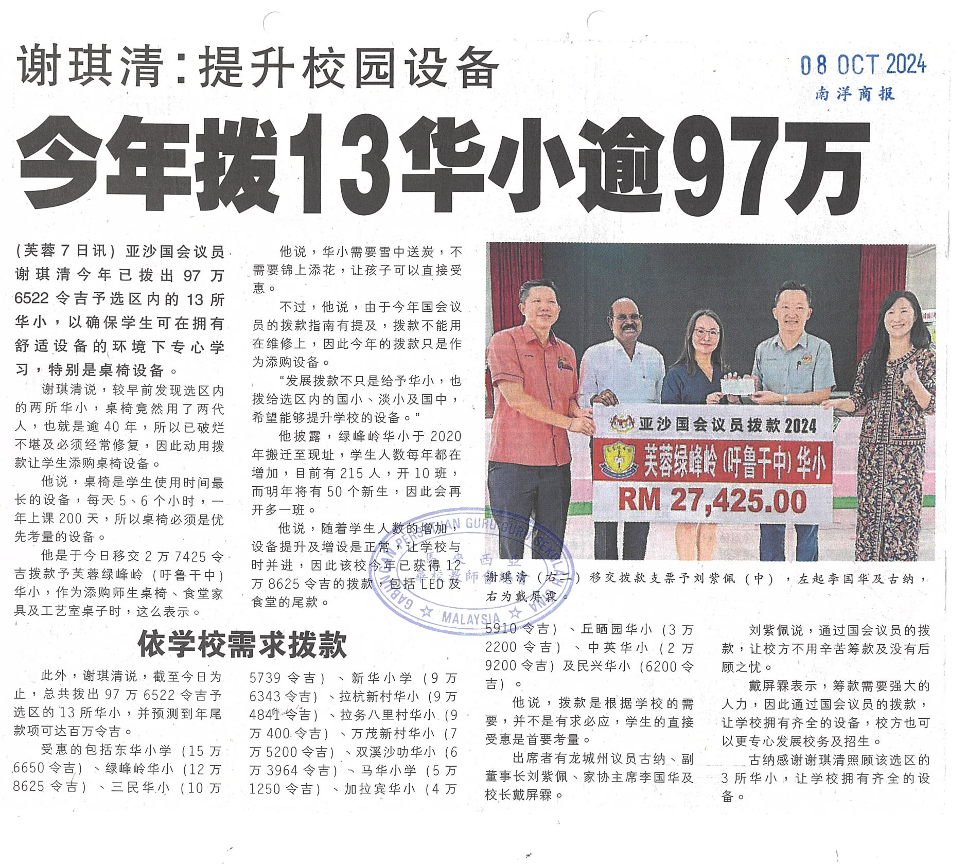 谢琪请:提升校园设备 今年拨13华小逾97万 WhatsApp 上一篇文章: 蔡文铎:董联会收集数据解困 不谙华语教师派砂华小 上一页 下一篇文章: 1.6万人申请砂教师特聘 筛选2千人面试争1733职 下一页