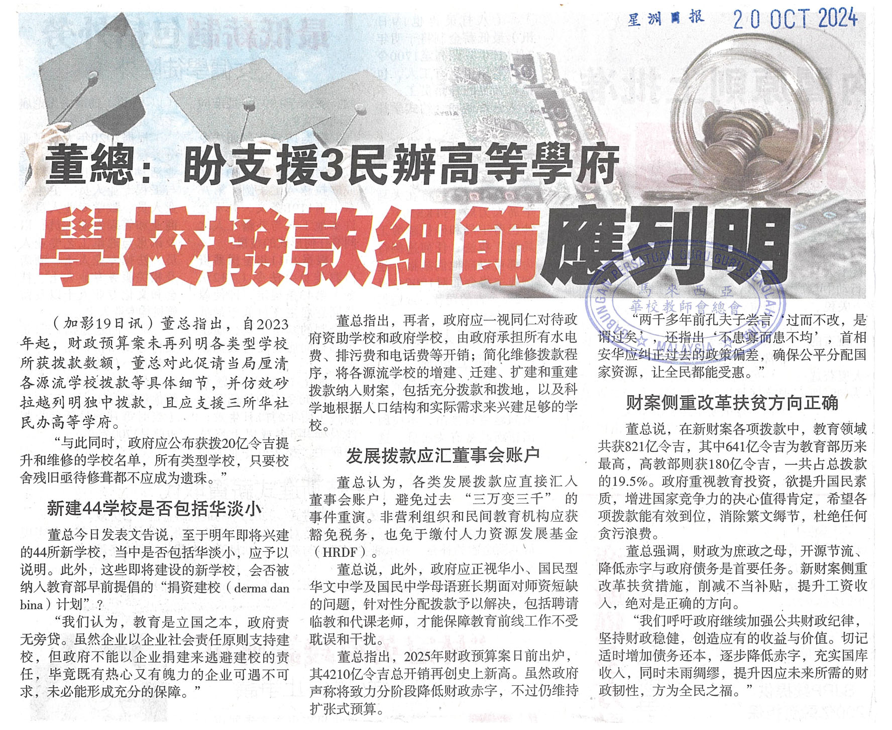 董总:盼支援3民办高等学府  学校拨款细节应列明