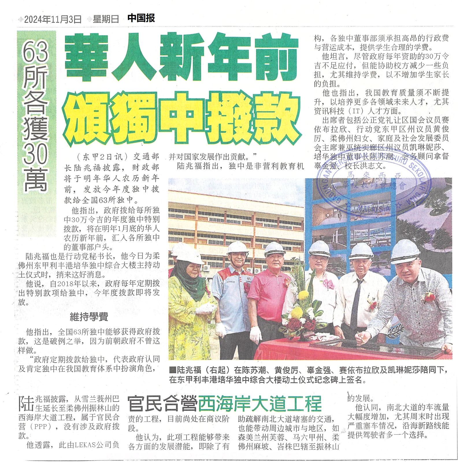 华人新年前颁独中拨款 63所各获30万