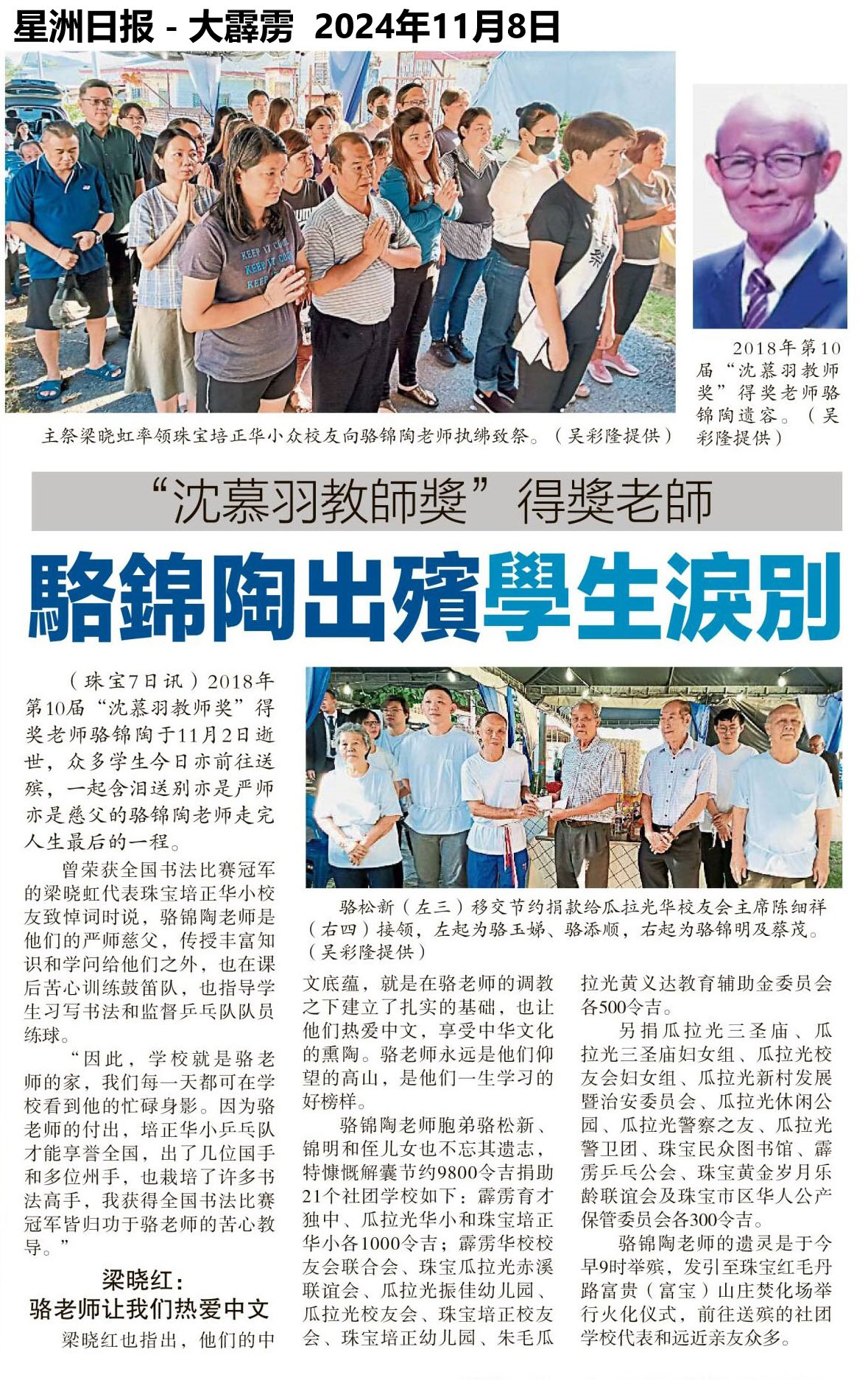 “沈慕羽教师奖”得奖老师 骆锦陶出殡学生泪别