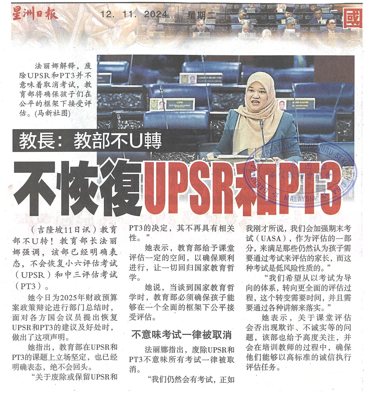 教长:教部不U转  不恢复UPSR和PT3