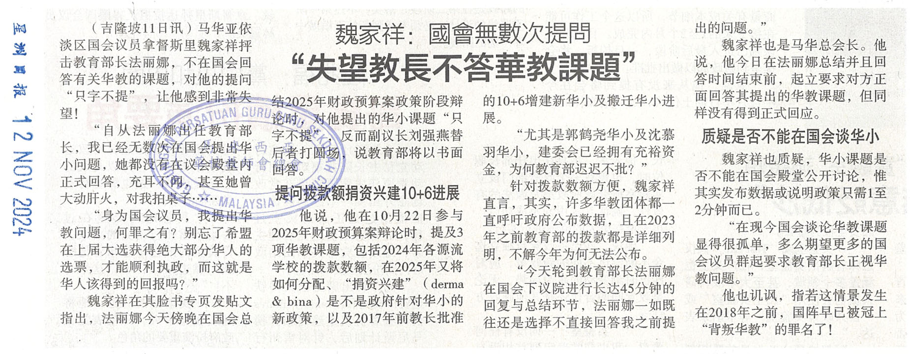 魏家祥:国会无数次提问“失望教长不答华教课题” WhatsApp 上一篇文章: 黄家和:未提民事诉讼 教部配合查1BestariNet 上一页 下一篇文章: 高教部长:联邦未有类似砂决策 统考生不能进政府大学 下一页