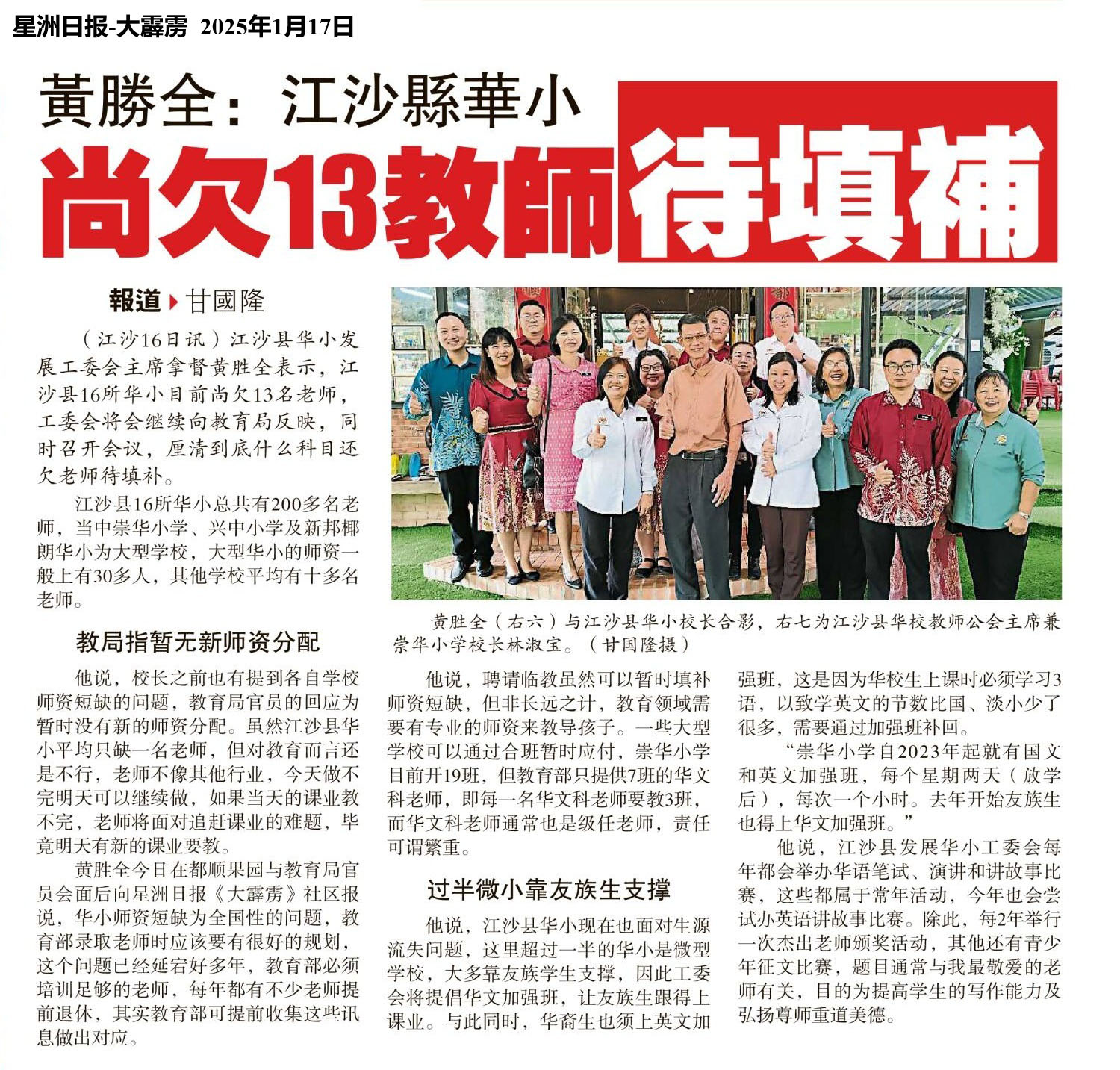 黄胜全:江沙县华小 尚欠13教师待填补