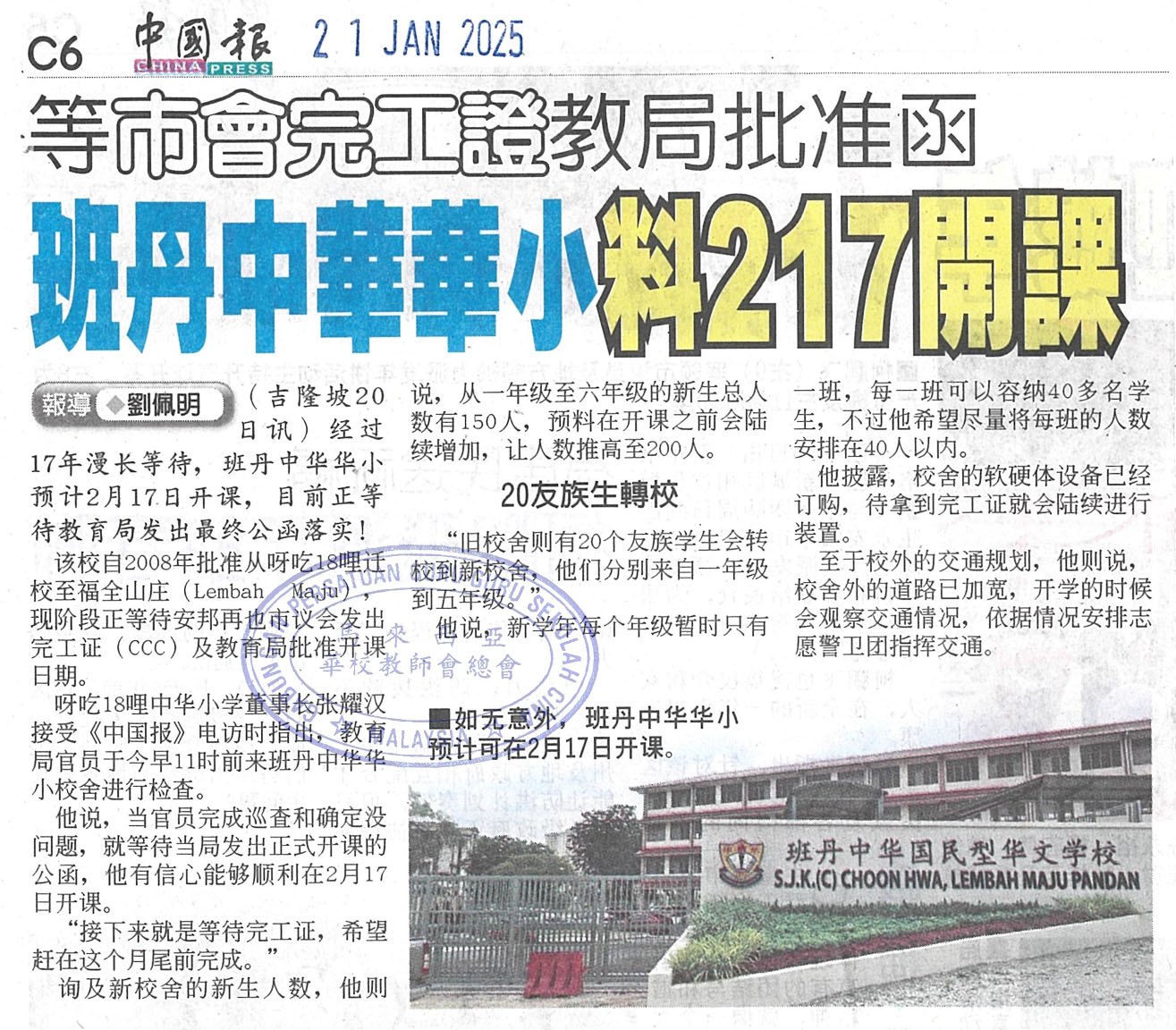 班丹中华华小料217开课 ,等市会完工证 ,教局批准函 WhatsApp 上一篇文章: 高层走访全国143教局·教部重点关注辍学 上一页 下一篇文章: 中文促进会:料5月出版 缩写STPM教学手册 下一页
