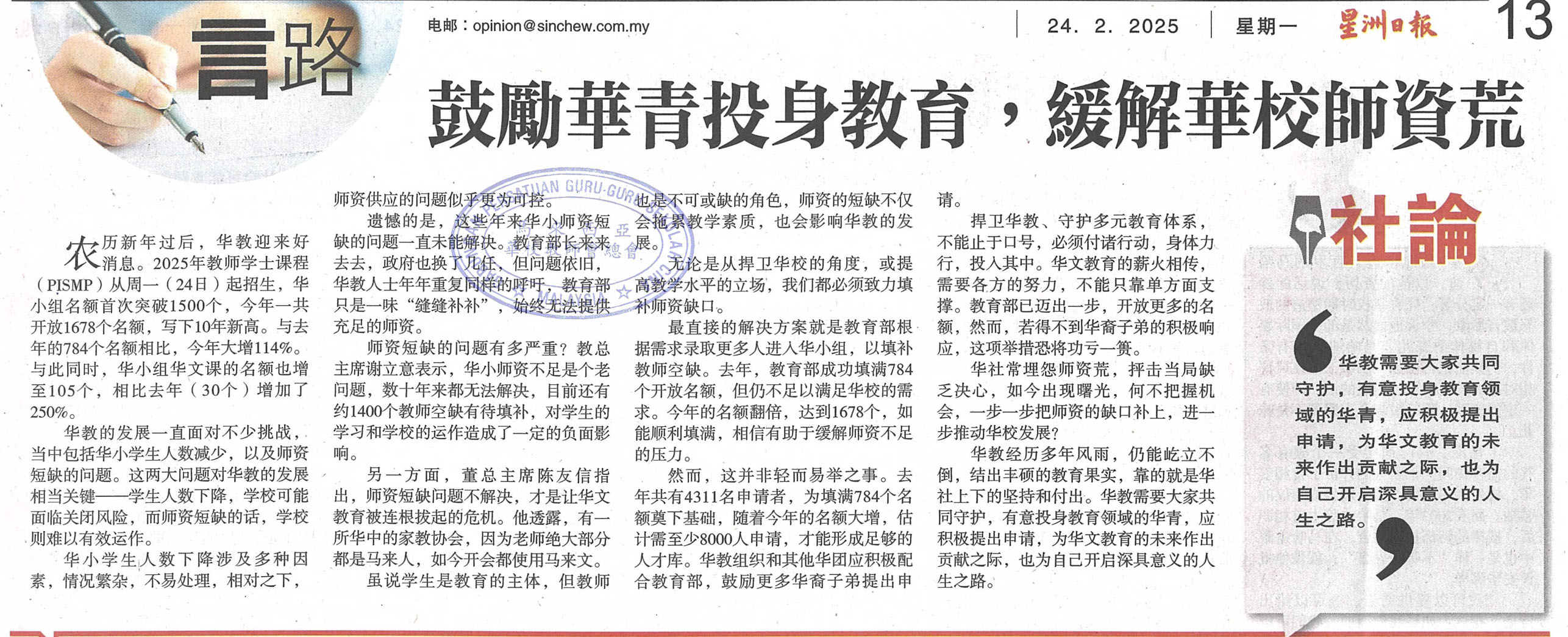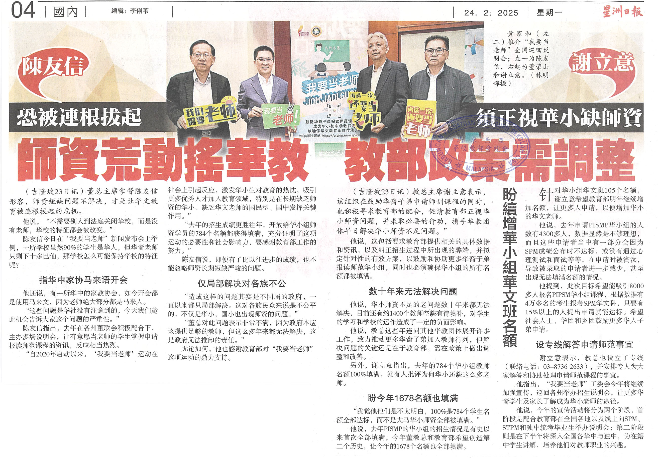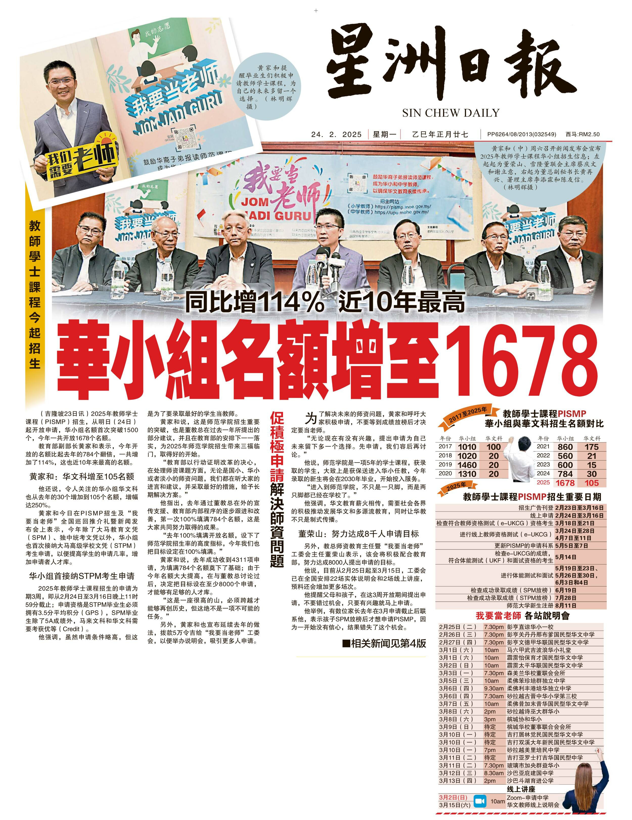 教师学士课程今起招生,华小组名额增至1678,同比增114%,近10年最高 WhatsApp 上一篇文章: 净电能计量政府组别,半津华淡小可申请 上一页 下一篇文章: 陈友信:华教大厦年内动工,发动众筹目标2000万 下一页