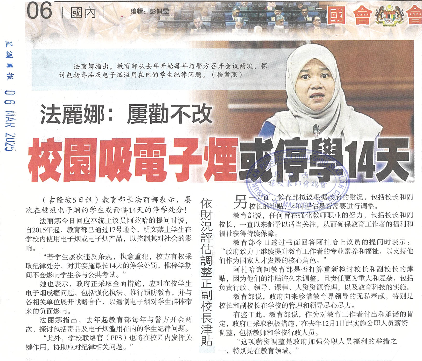 法丽娜:屡劝不改,校园吸电子烟或停学14天