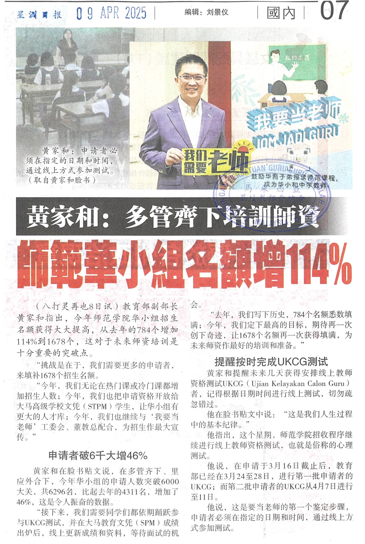 黄家和:多管齐下培训师资,师范华小组名额增114% WhatsApp 上一篇文章: 加影增建华中,设育华二校限制收生,指定8华小仅2华小 上一页 下一篇文章: 谢立意:勇敢坚持到退休之龄 华小教师别提早“退缩” 下一页