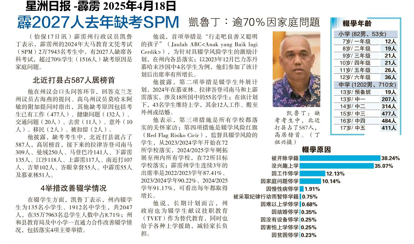霹雳2027人去年缺考SPM 凯鲁丁:逾70%因家庭问题 WhatsApp 上一篇文章: 教长:推动多层面改革 专注加强数理AI教育 上一页 下一篇文章: 人口外流学生骤减 亚亦君令6华小全微型 下一页