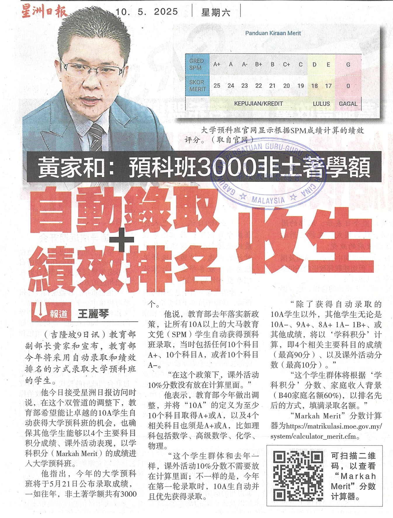 黄家和:预科班3000非土著学额,自动录取+绩效排名收生