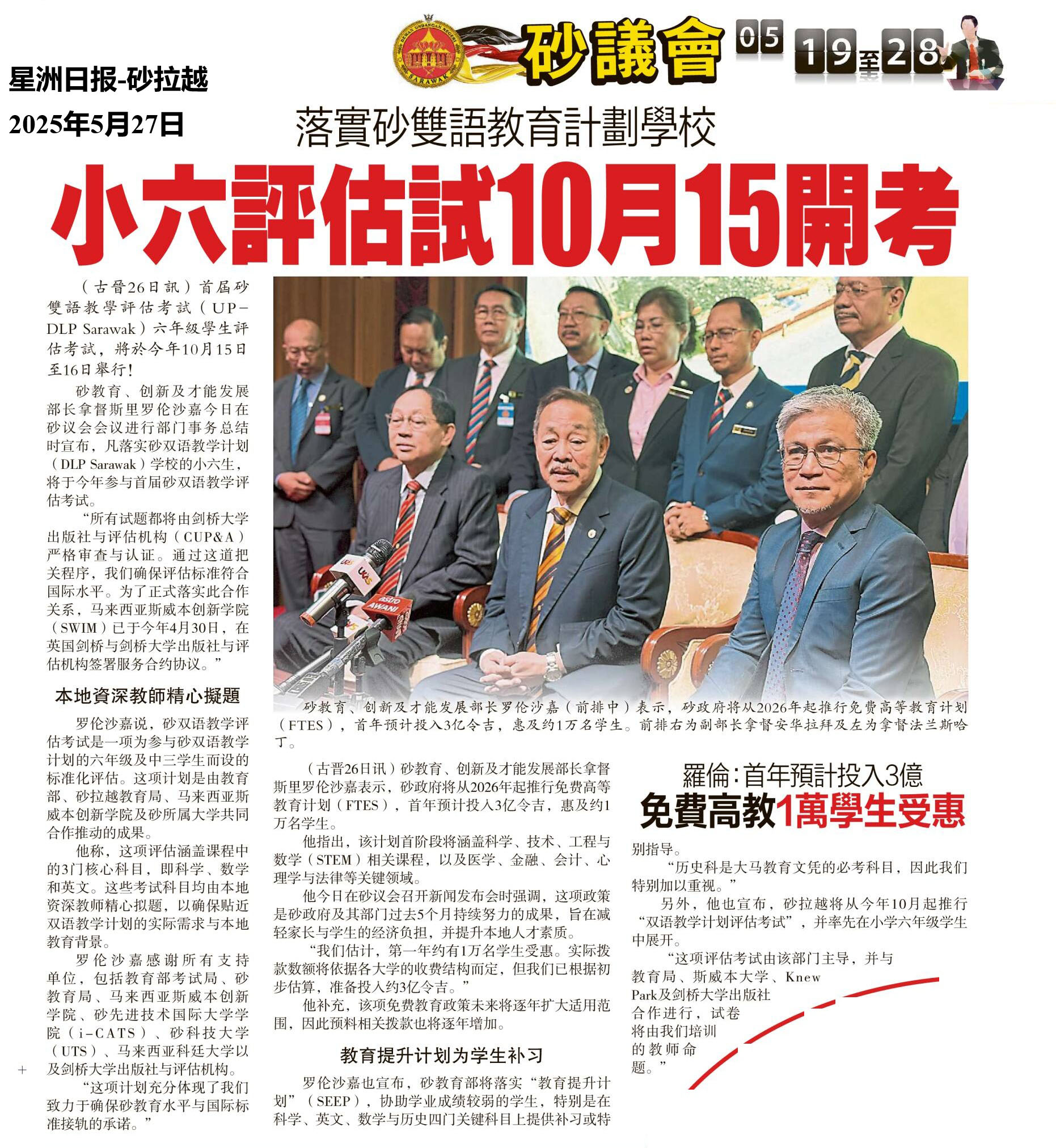 落实砂双语教育计划学校 小六评估试10月15开考