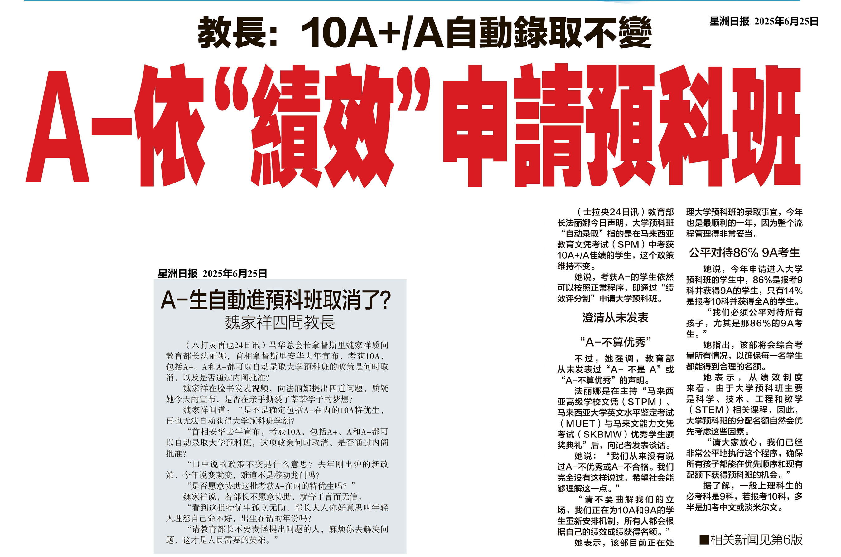 教育部长:10A+/A自动录取不变 A-依“绩效”申请预科班