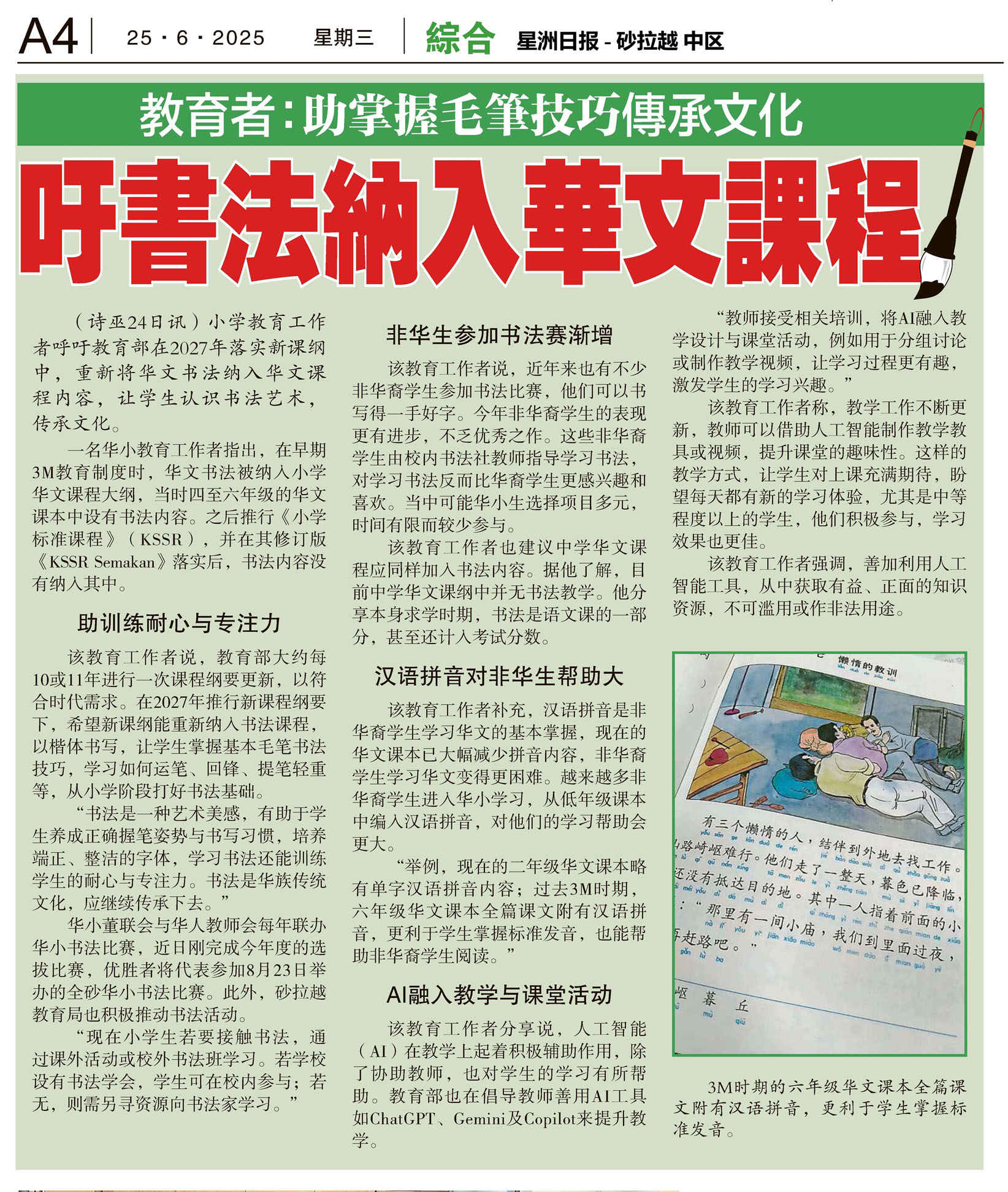 教育者:助掌握毛笔技巧传承文化 吁书法纳入华文课程