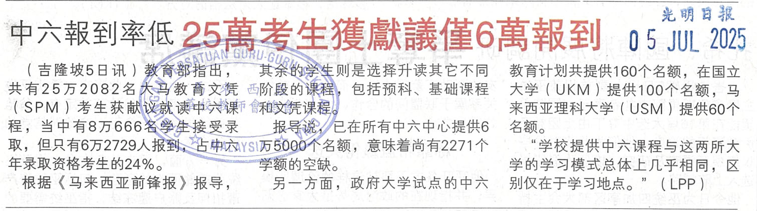 中六报到率低,25万考生获献议仅6万报到 WhatsApp 上一篇文章: 建校委会:获柔政府批地,郭小只欠教部批文 上一页 下一篇文章: “2人9科全A+被拒入大学预科班”魏家祥:政策有缺陷应检讨 下一页