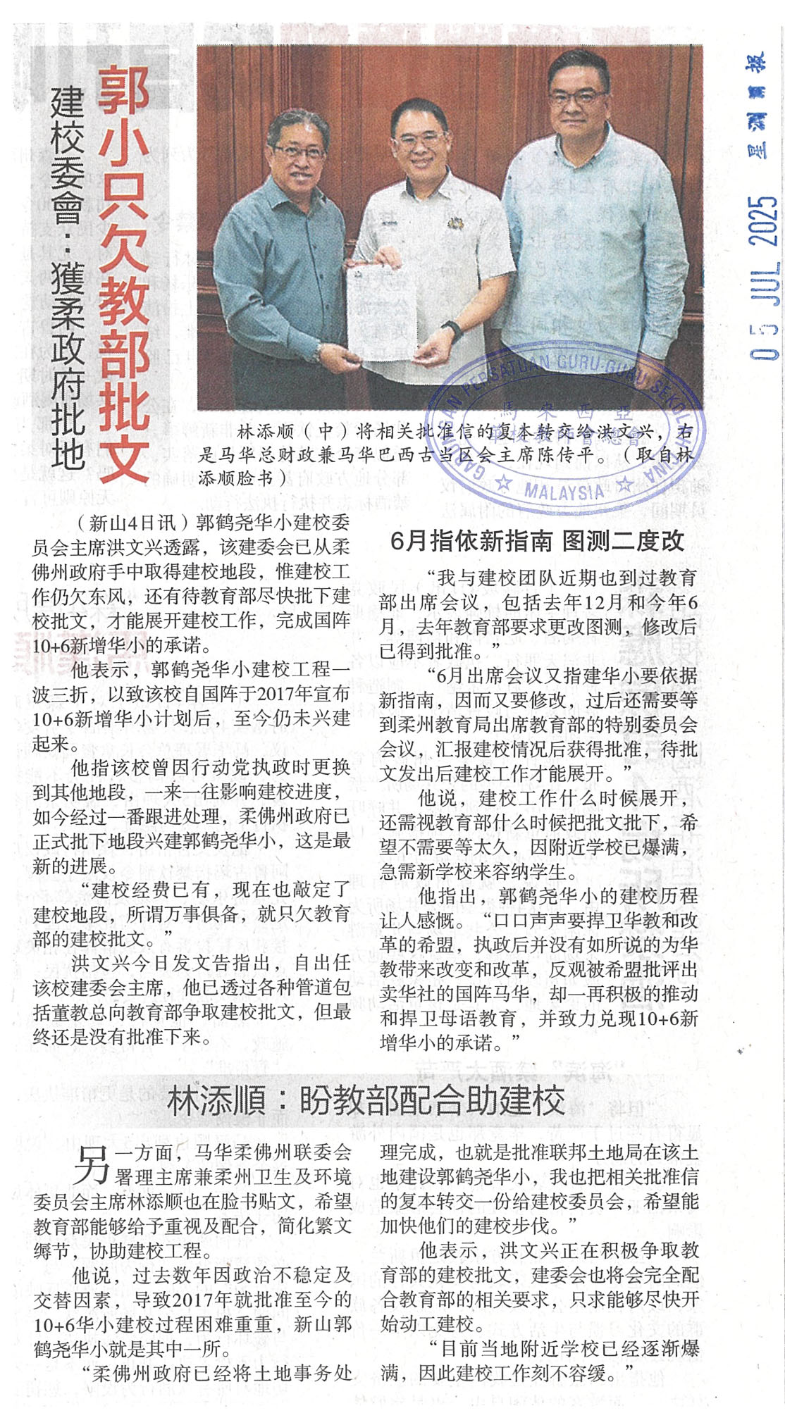 建校委会:获柔政府批地,郭小只欠教部批文
