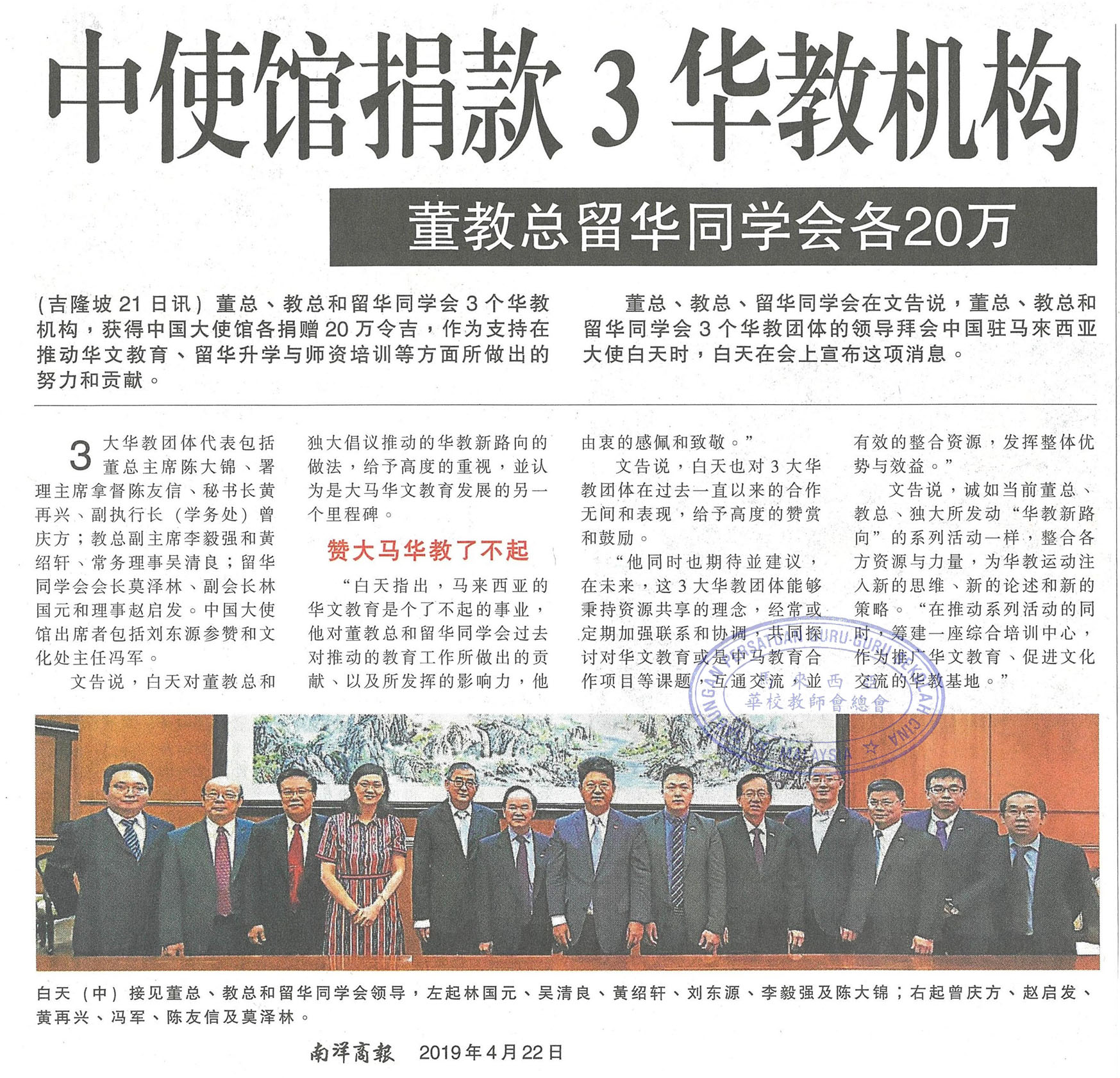 中使馆捐款3华教机构 董教总留华同学会各20万