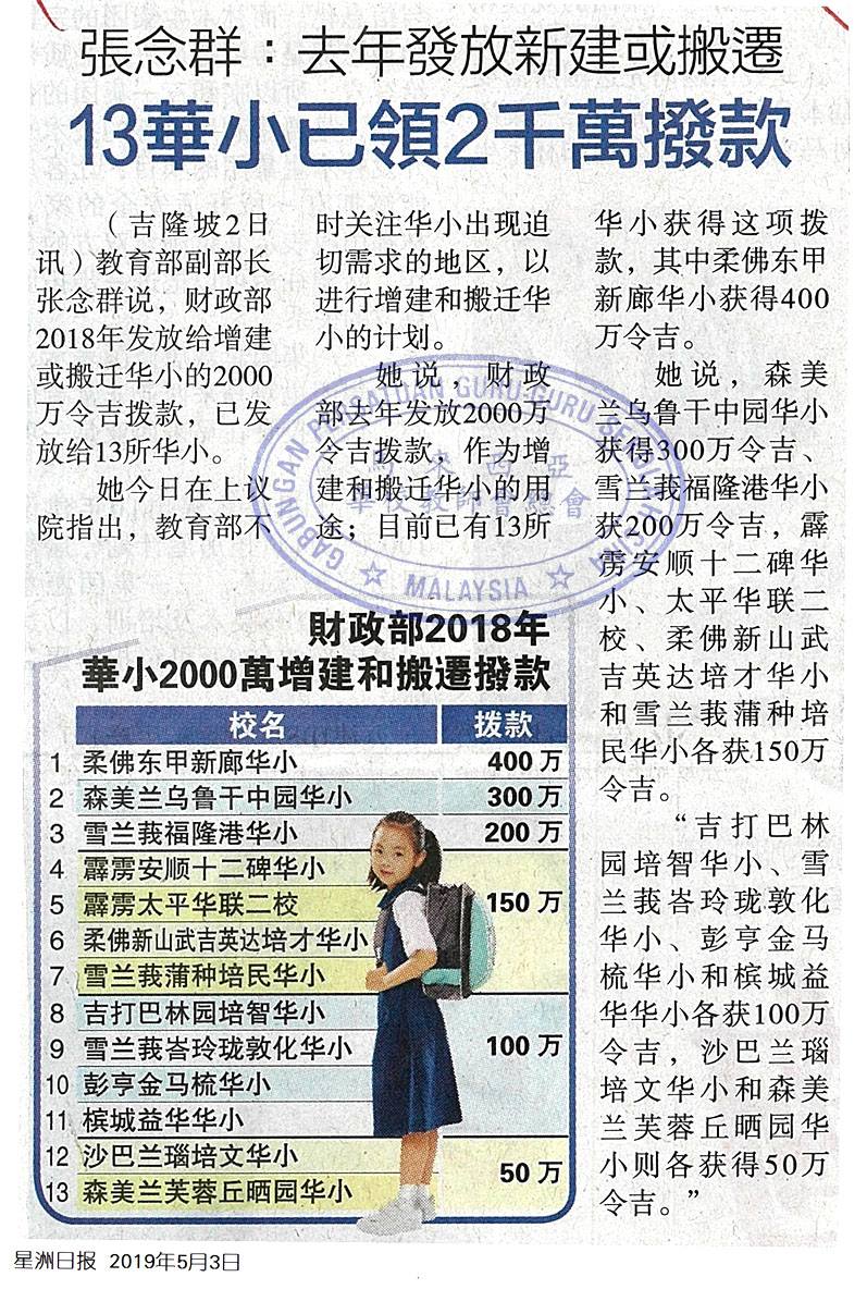 张念群:去年发放新建或搬迁 13华小已领2千万拨款