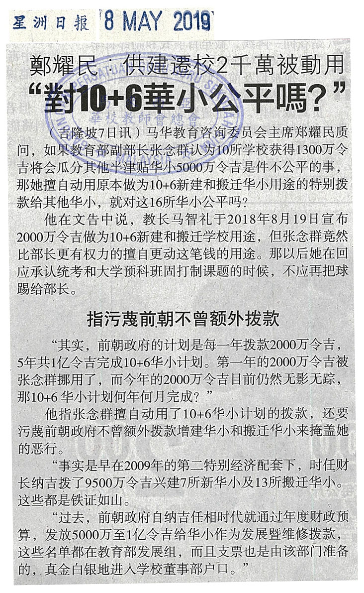 郑耀民;供建迁校2千万被动用 对10+6华小公平吗?