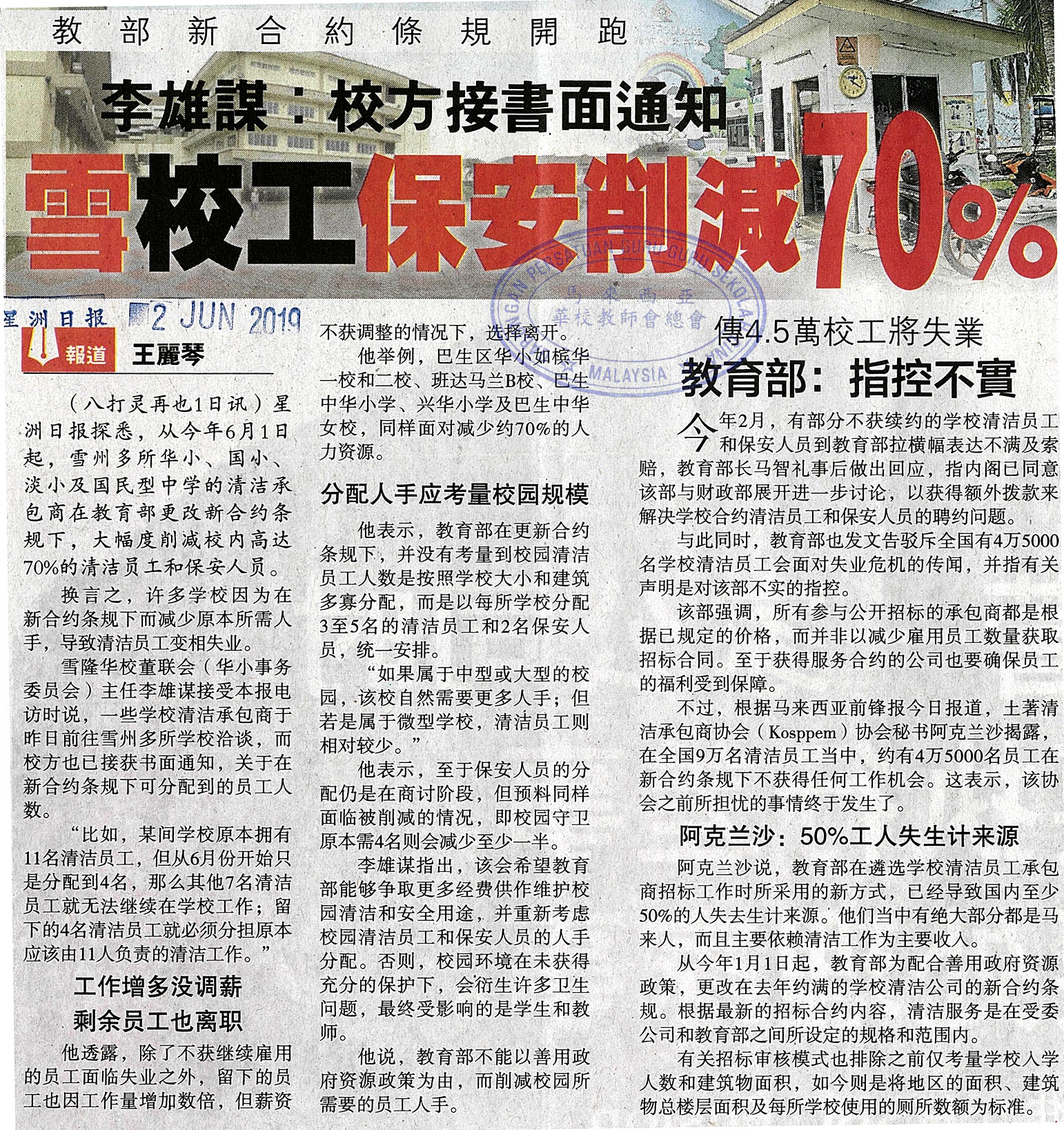 李雄谋:校方接书面通知 雪校工保安削减70%