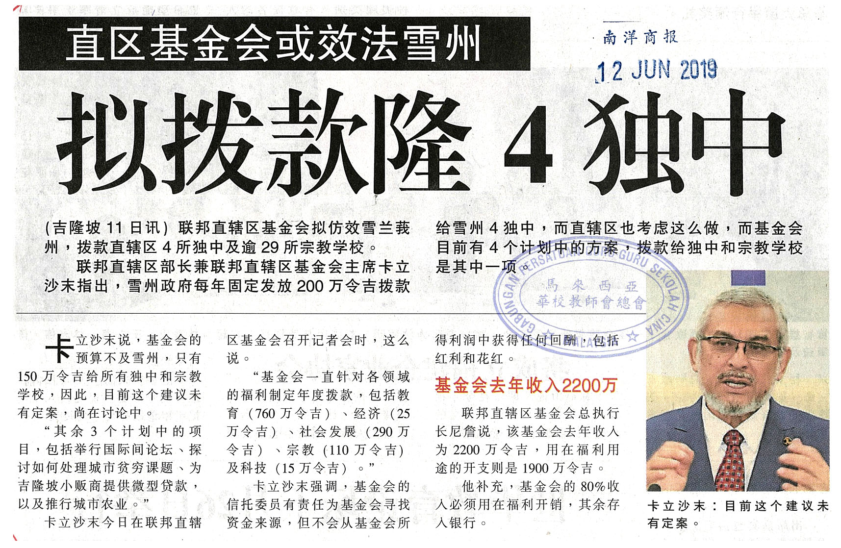 直区基金会或效法雪州 拟拨款隆4独中