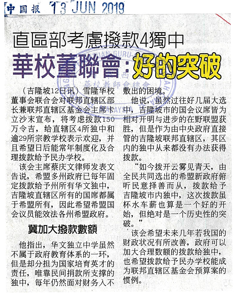 直区部考虑拨款4独中 华校董联会:好的突破