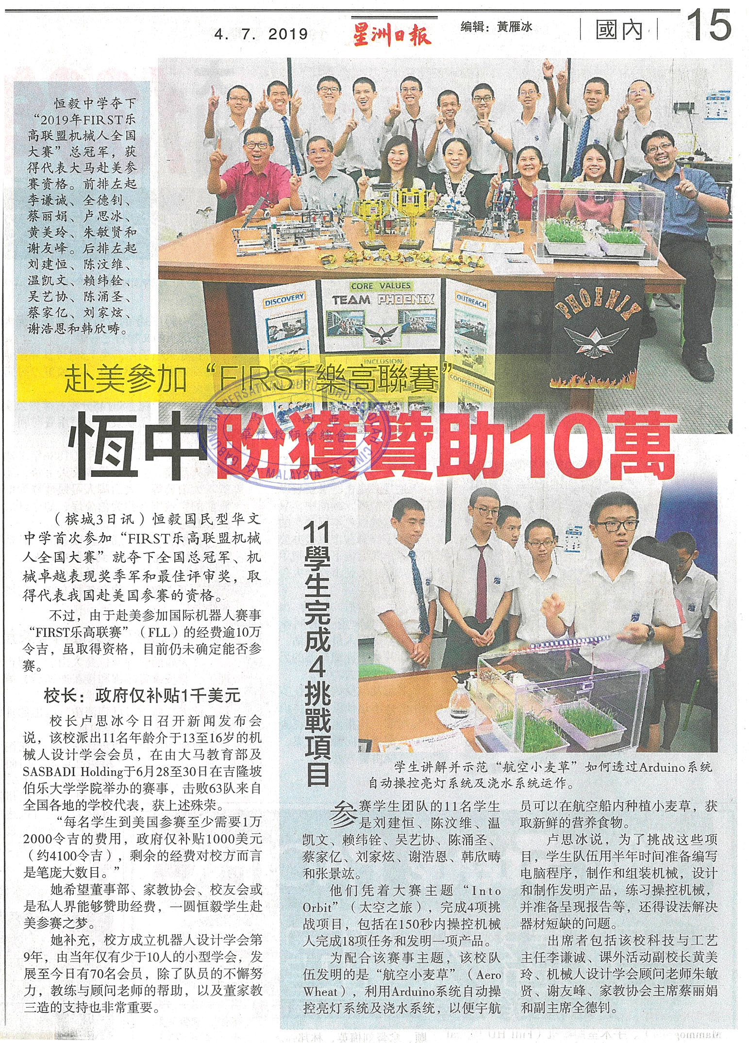 赴美参加“First”乐高联赛 恒中盼获赞助10万
