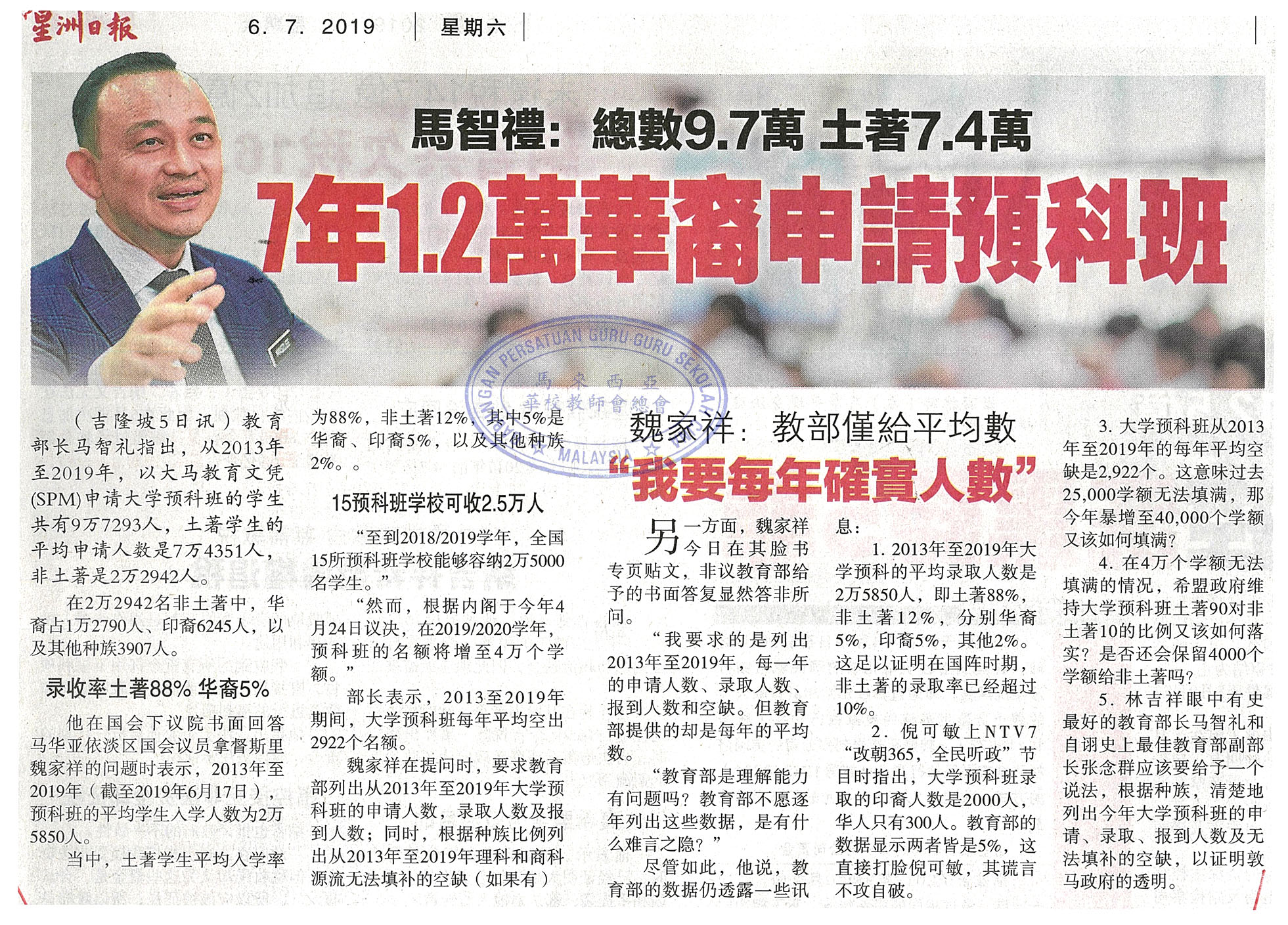 马智礼:总数9.7万 土著7.4万 7年1.2万华裔申请预科班 WhatsApp 上一篇文章: 雪隆华小家协提诉求 盼张念群助解困境 上一页 下一篇文章: Yes校园电讯塔变商用 教部:3年损失逾2亿 下一页