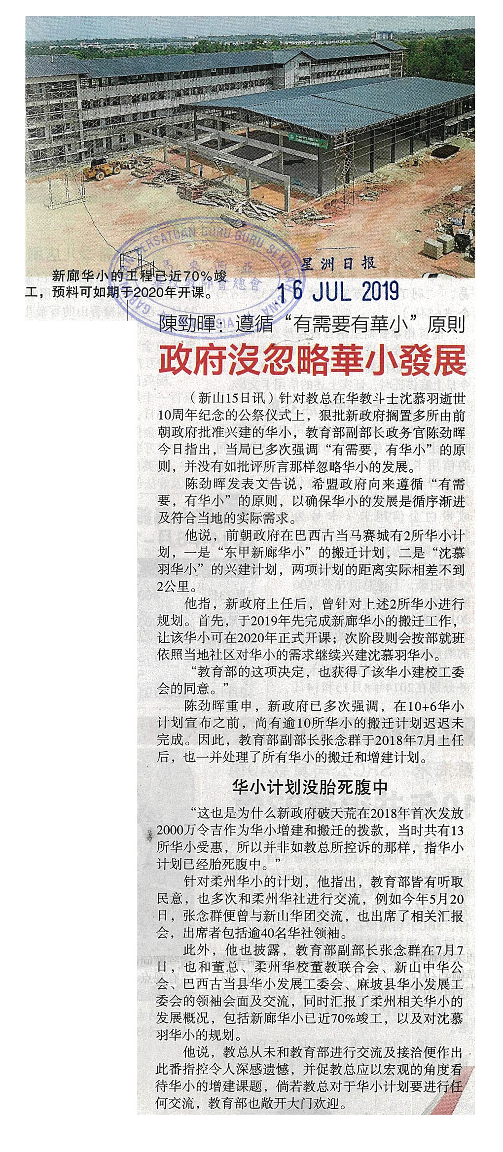 陈劲晖:遵循“有需要有华小”原则 政府没忽略华小发展 WhatsApp 上一篇文章: 捍卫董总主办统考主权 方天兴促3家长放弃上诉 上一页 下一篇文章: 考试局发通令提醒教育局长 促考虑停办PT3预考 下一页