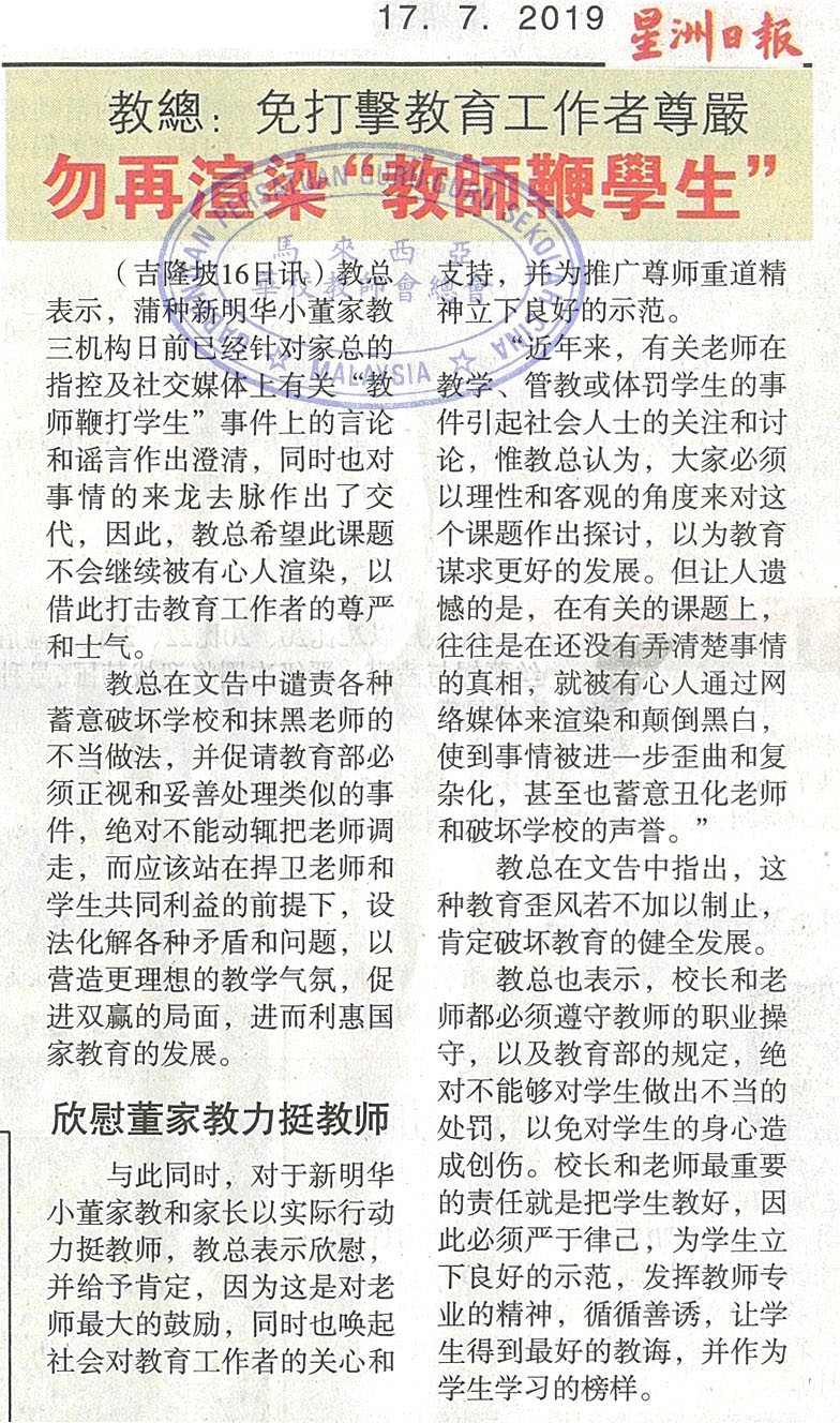 教总:免打击教育工作者尊严 勿再渲染“教师鞭学生” WhatsApp 上一篇文章: BANTAH PELAKSANAAN SEMULA PPSMI 上一页 下一篇文章: 教总:华教老问题 促政府履行建华小责任 下一页