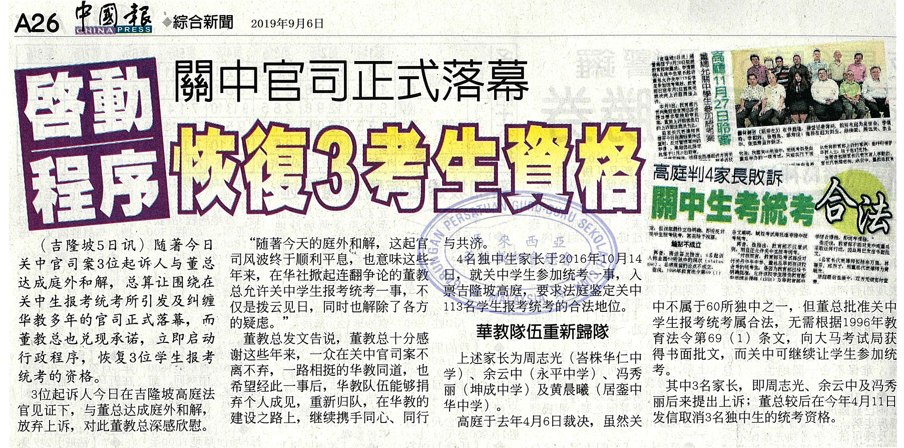 启动程序 关中官司正式落幕 恢复3考生资格