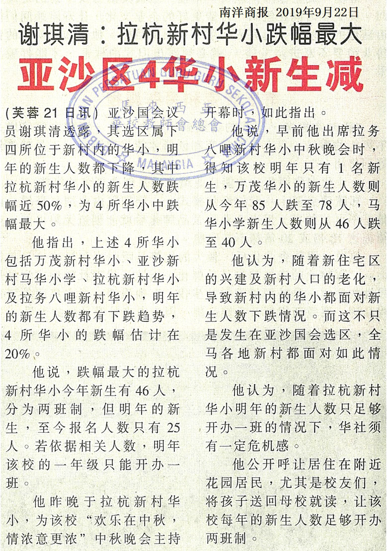 谢琪清:拉杭新村华小跌幅最大 亚沙区4华小新生减