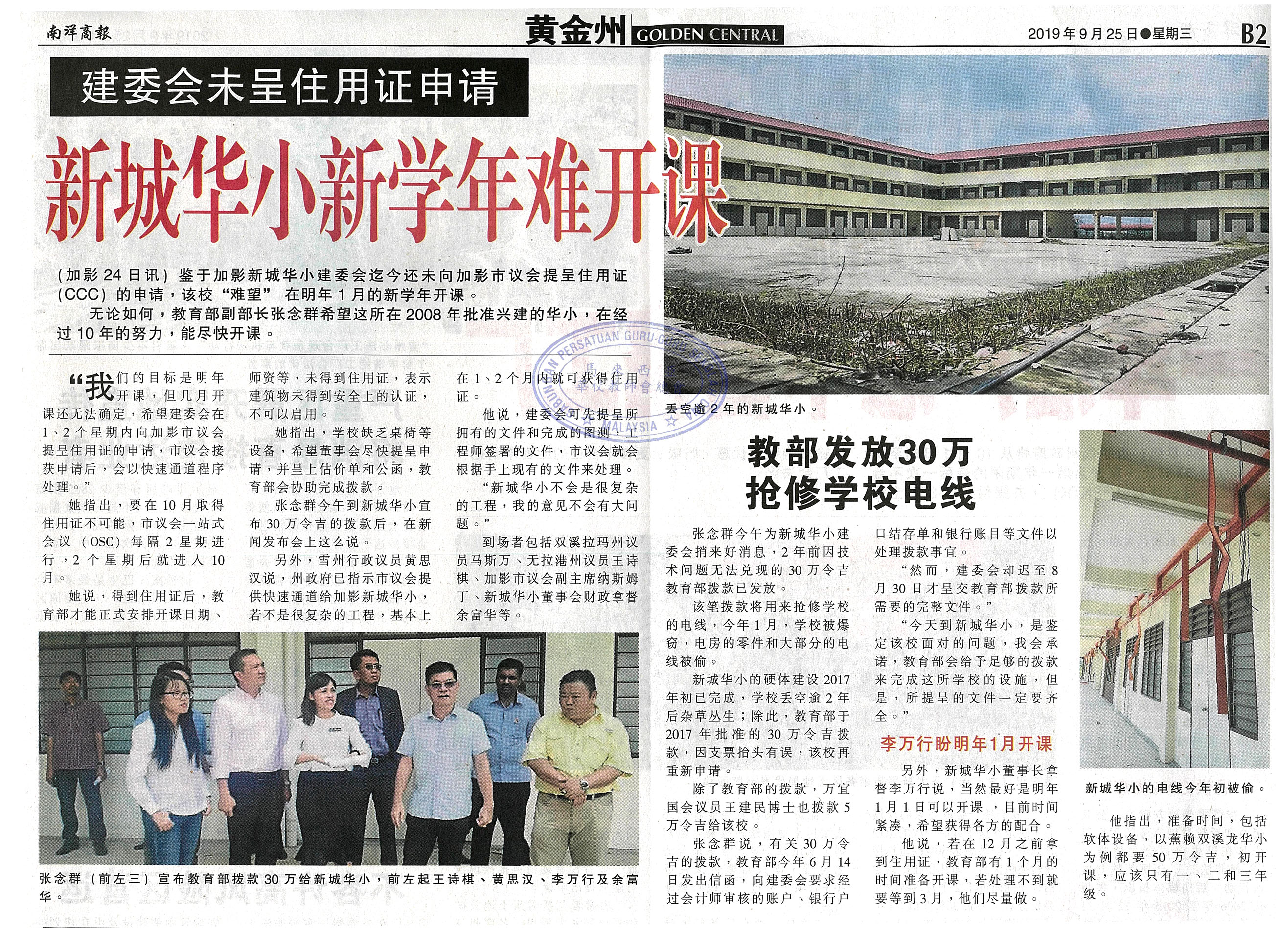 建委会未呈住用证申请 新城华小新学年难开课
