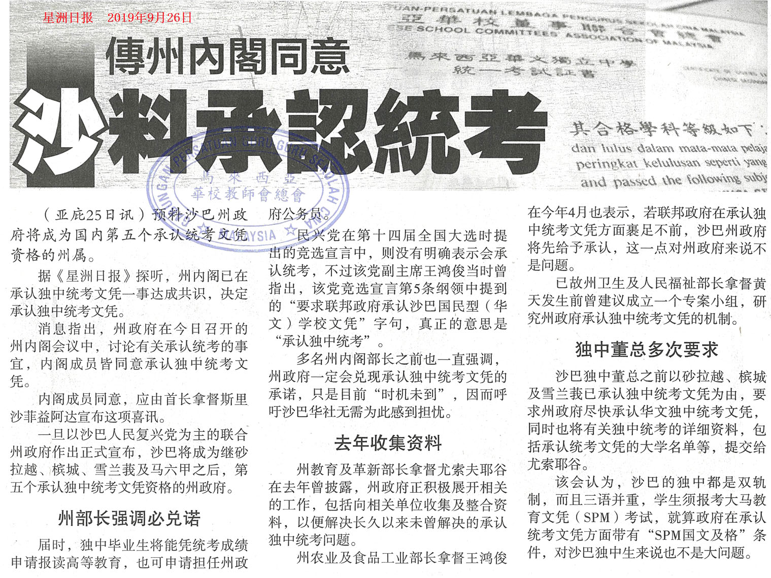 传州内阁同意 沙料承认统考