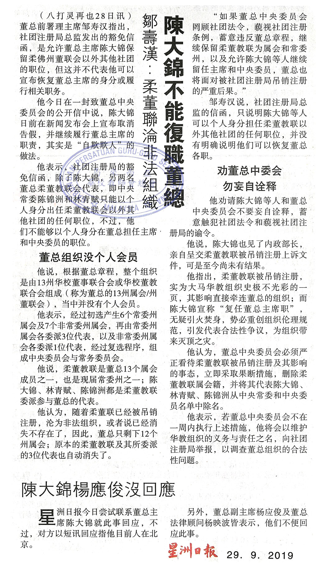 邹寿汉:柔董联沦非法组织 陈大锦不能复职董总