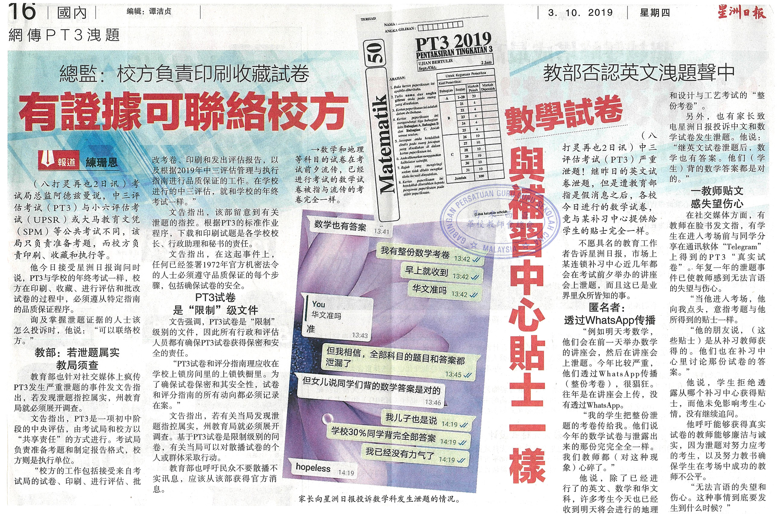 总监:校方负责印刷收藏试卷 有证据可联络校方