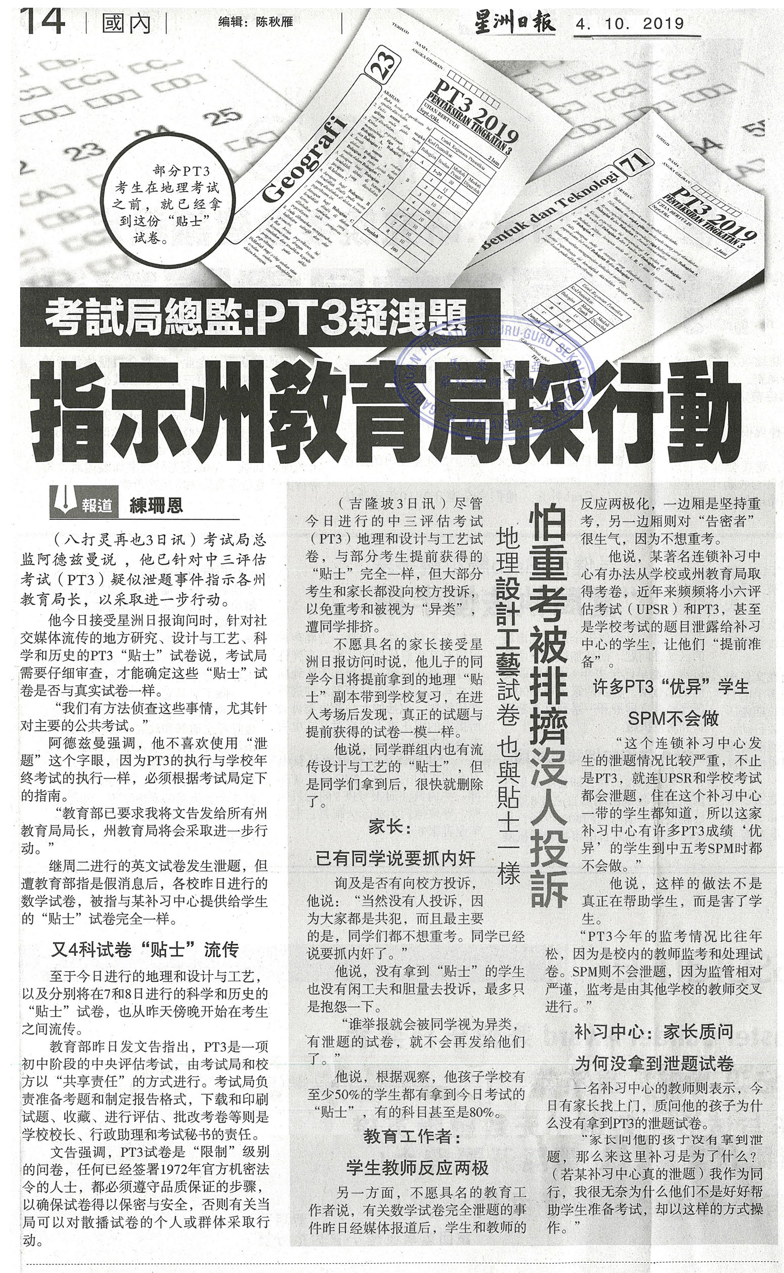 考试局总监:PT3疑泄题 指示州教育局採行动