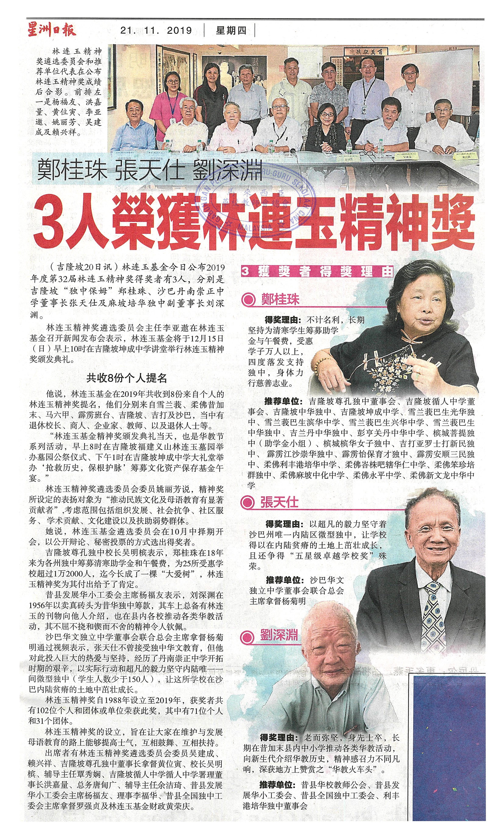 郑桂珠 张天仕 刘深渊 3人荣获林连玉精神奖