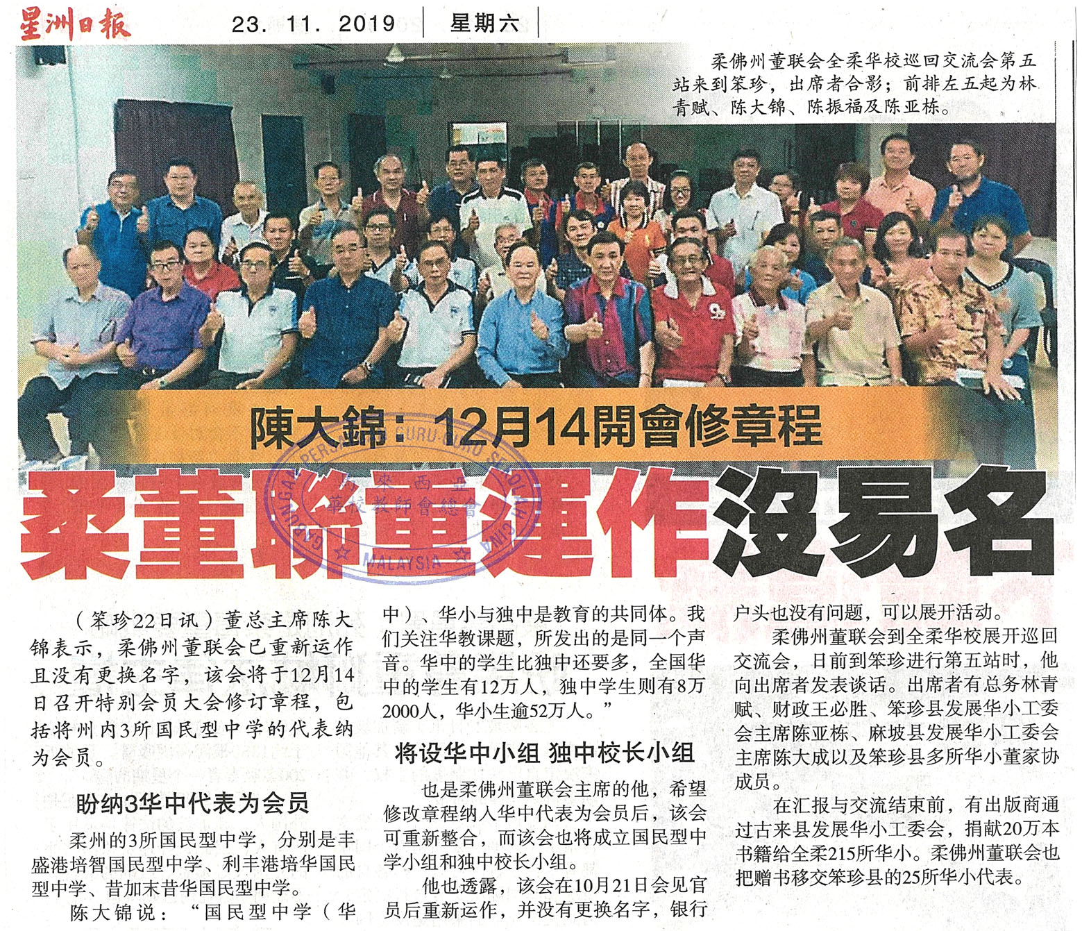 陈大锦:12月14开会修章成 柔董联重运作没易名