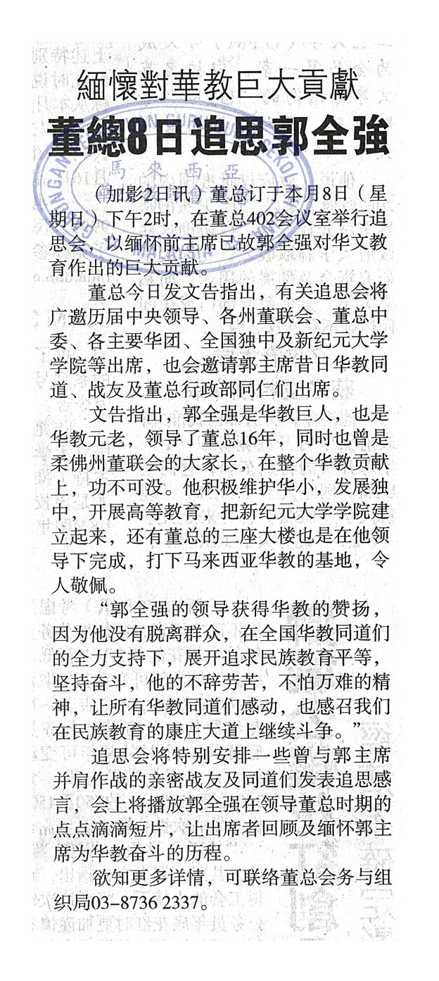 缅怀对华教巨大贡献 董总8日追思郭全强