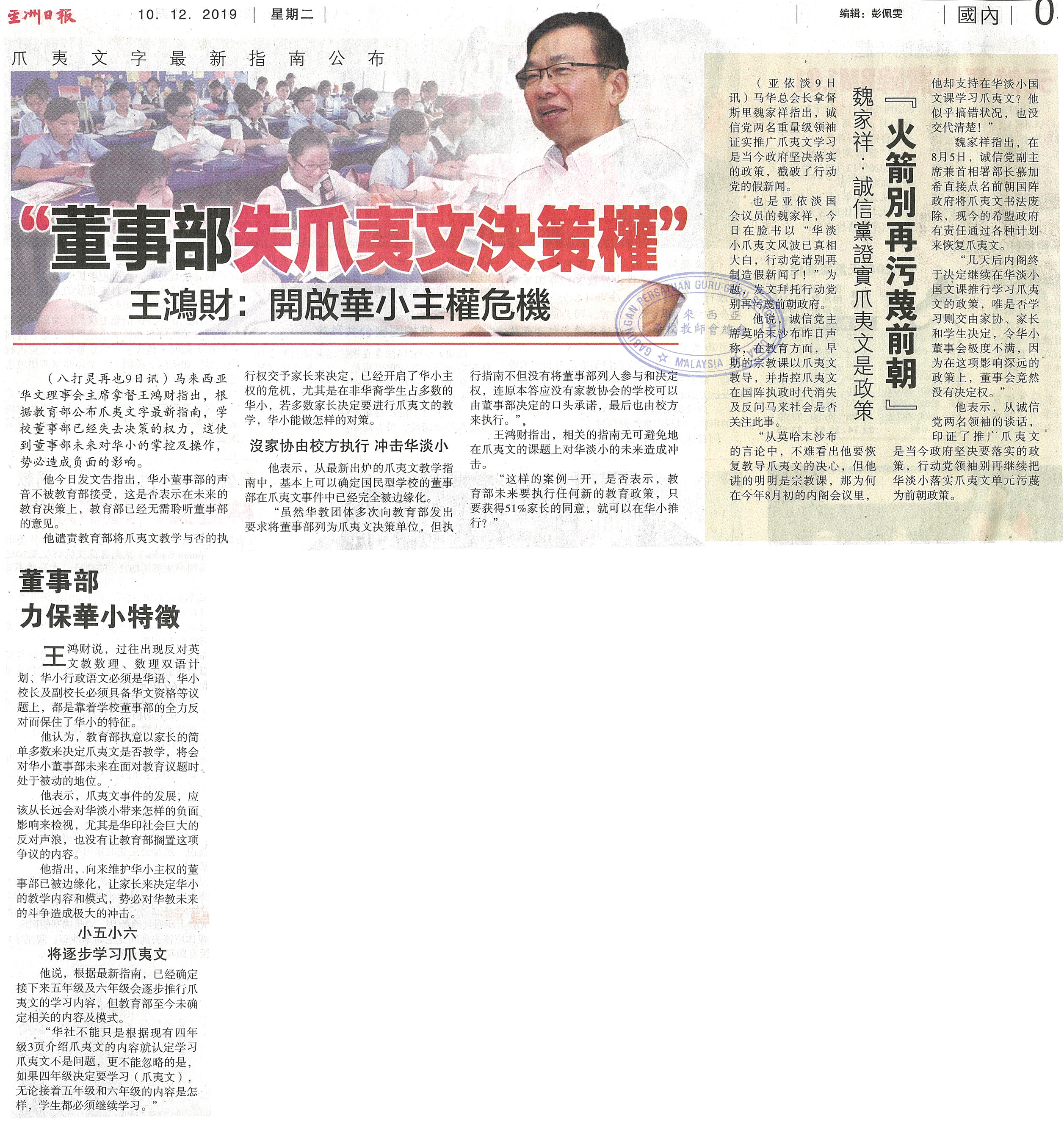 “董事部失爪夷文决策权” 王鸿财:开启华小主权危机