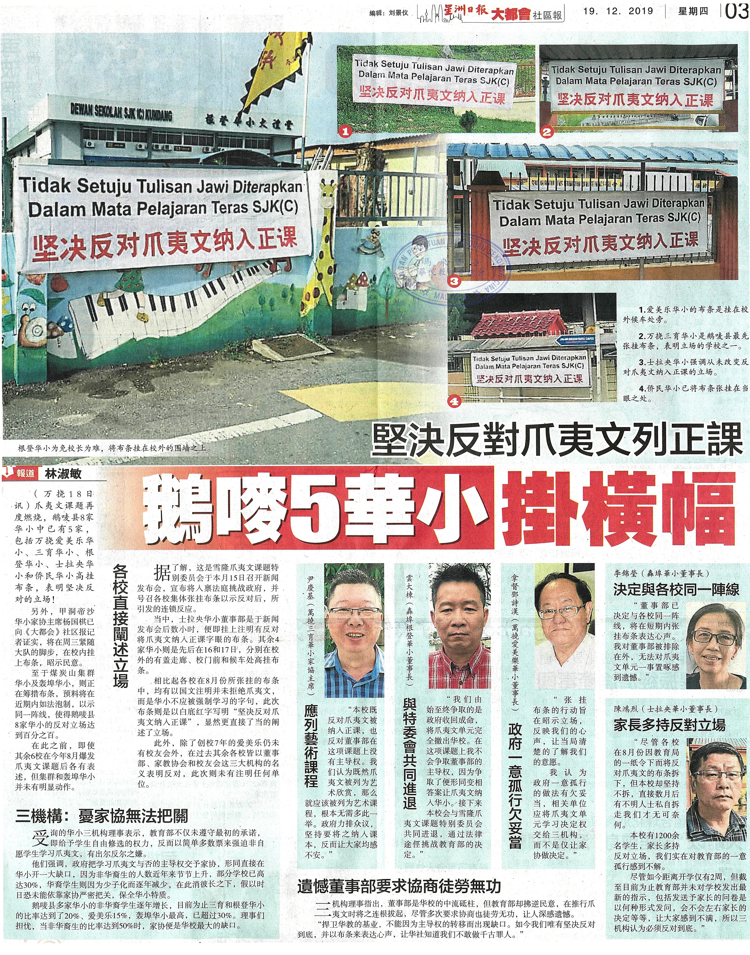 坚决反对爪夷文列正课 鹅唛5华小挂横幅