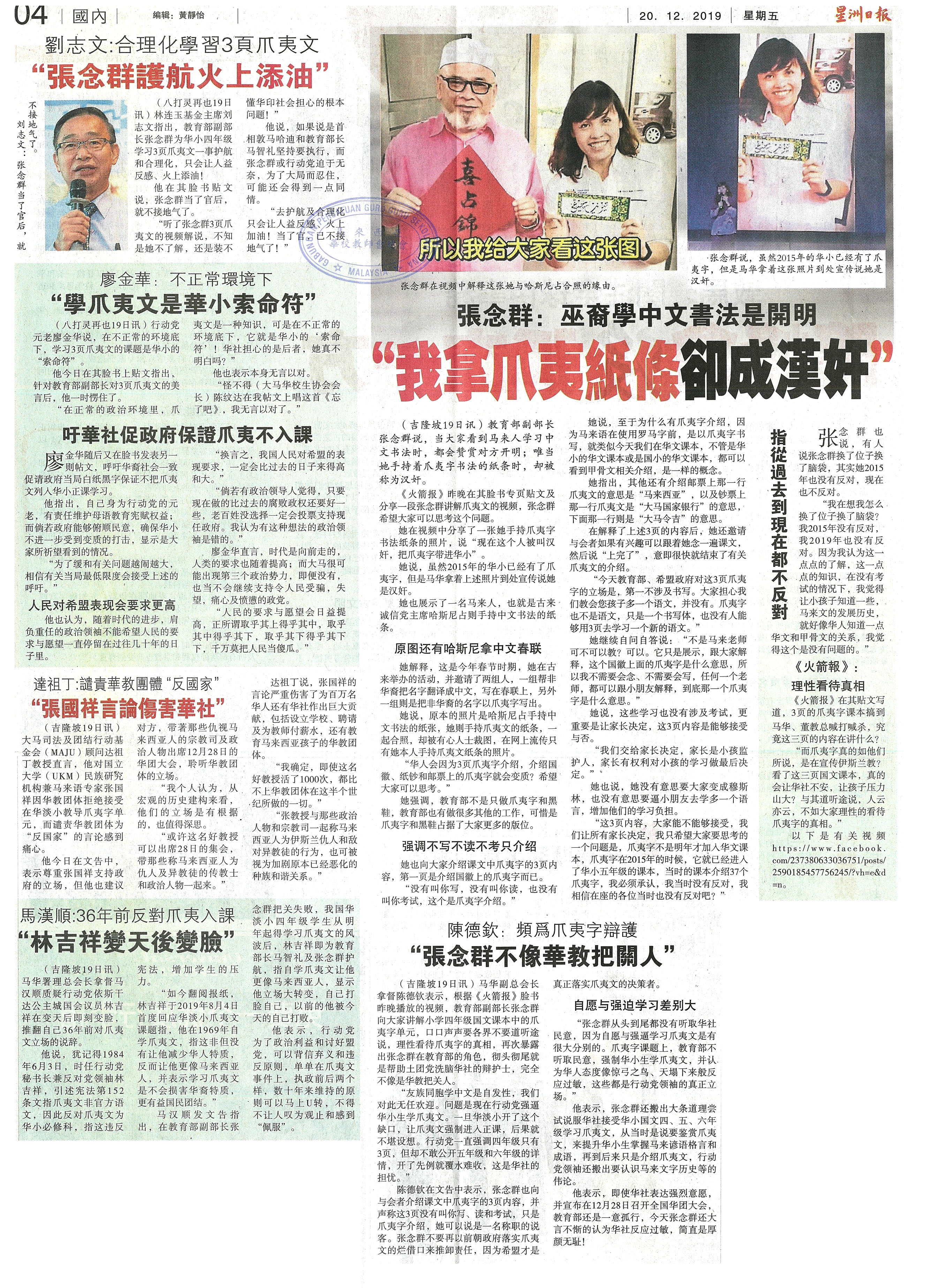 张念群:巫裔学中文书法是开明 “我拿爪夷纸条却成汉奸” WhatsApp 上一篇文章: 李官仁促请华裔国州议员 向首相进谏取消爪夷单元 上一页 下一篇文章: 马来组织脸书发动请愿 联署要求列董总非法 下一页