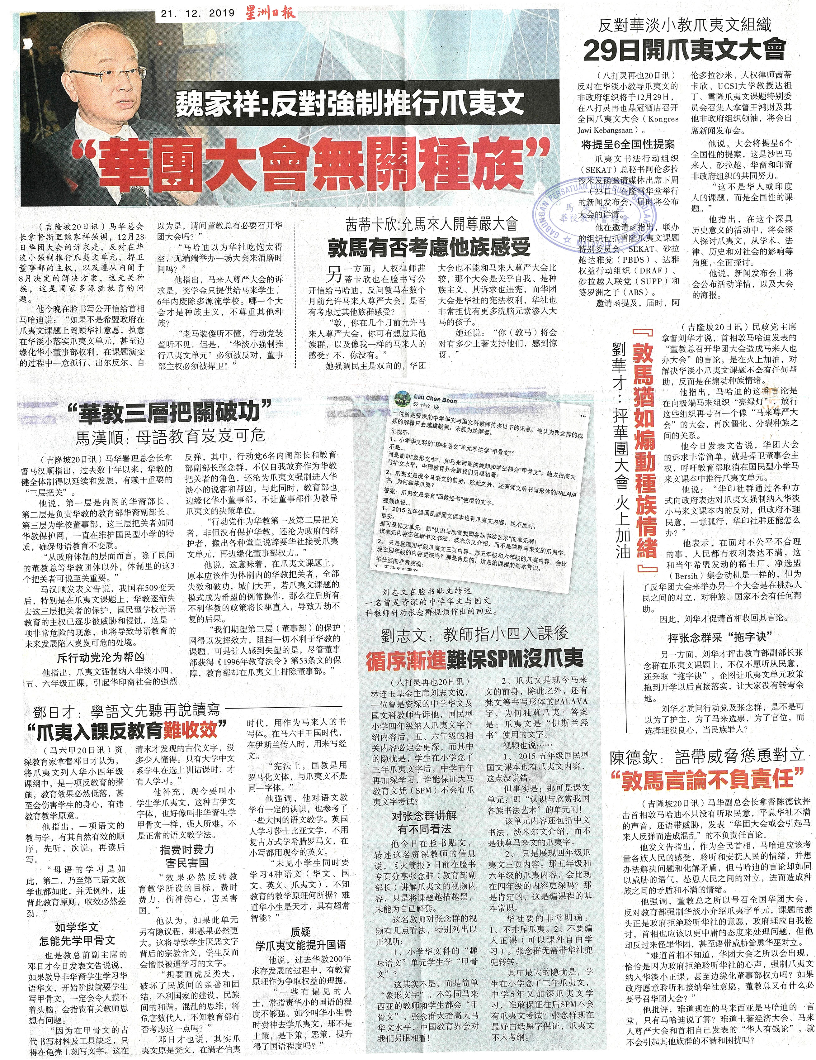 魏家祥:反对强制推行爪夷文 华团大会无关种族 WhatsApp 上一篇文章: 林吉祥:非反马来人反宪法 华团大会不会致动乱 上一页 下一篇文章: 邱武英:正处理结论部分 “承认统考报告年底完成” 下一页