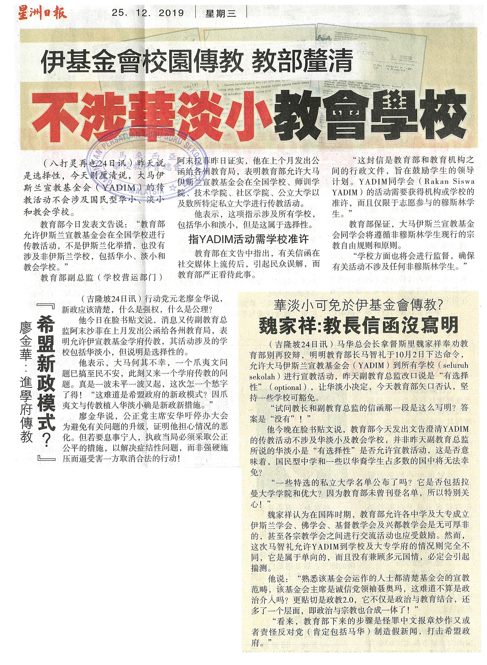伊基金会校园传教 教部厘清 不涉华淡小教会学校