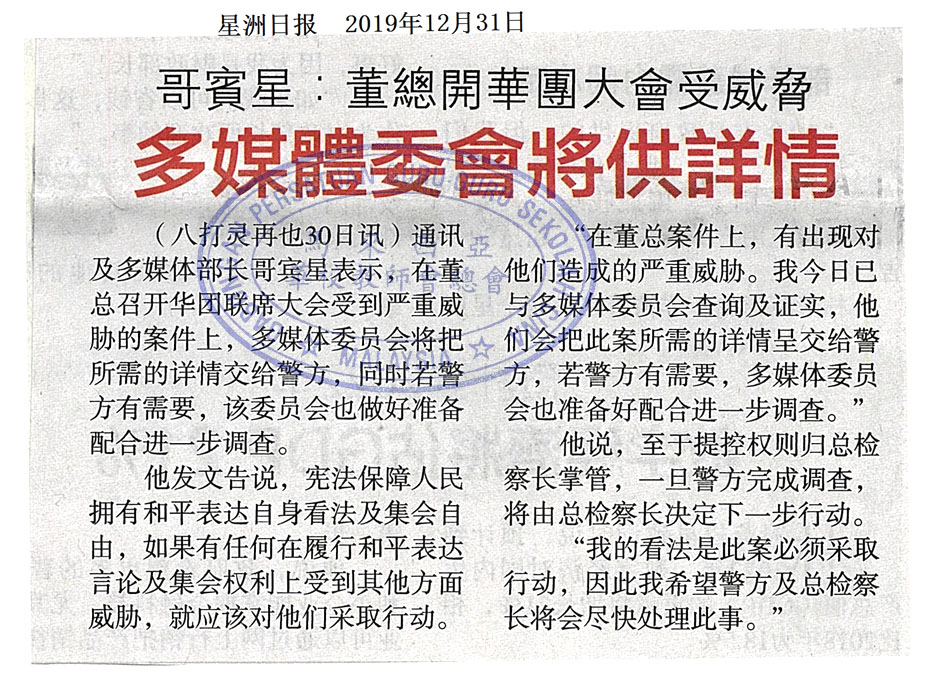 哥宾星:董总开华团大会受威胁 多媒体委会将供详情