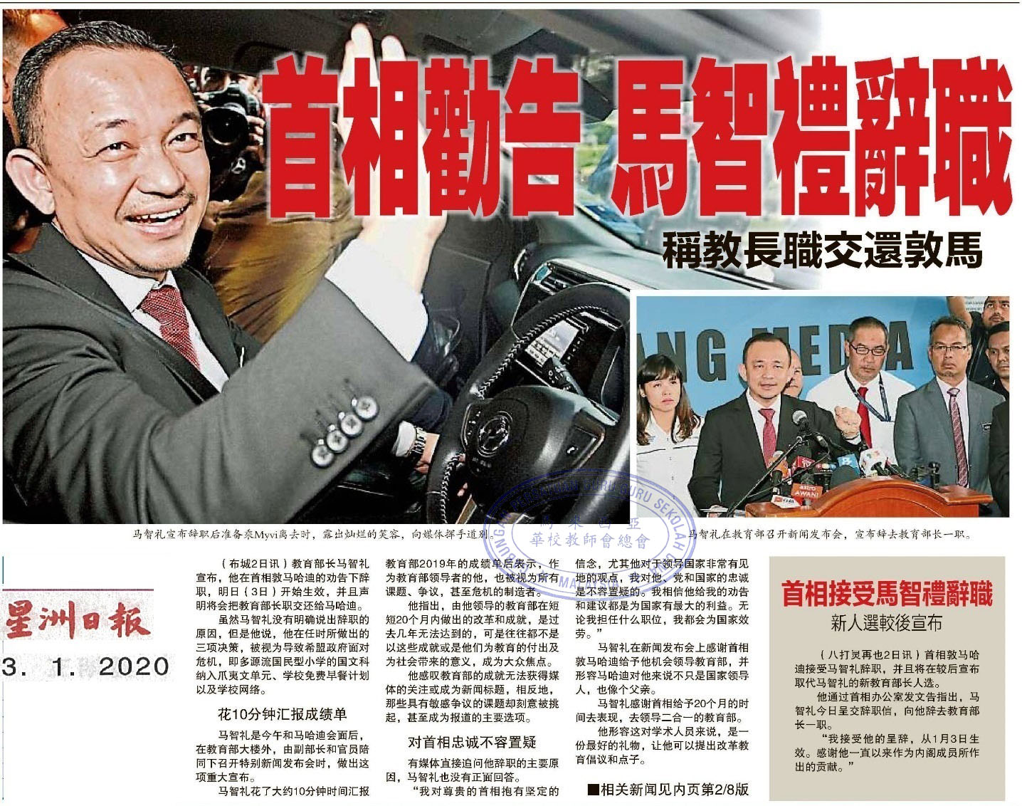 首相劝告 马智礼辞职 称教长职交还敦马