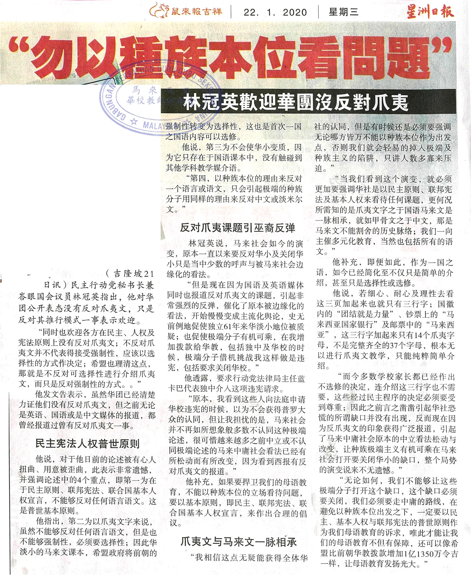 勿以种族本位看问题 林冠英欢迎华团没反对爪夷 WhatsApp 上一篇文章: SEKAT:展示州和谐团结精神 砂国语大会2月举行 上一页 下一篇文章: 免费食物辅助改善计划开跑 首阶段4千学生受惠 下一页