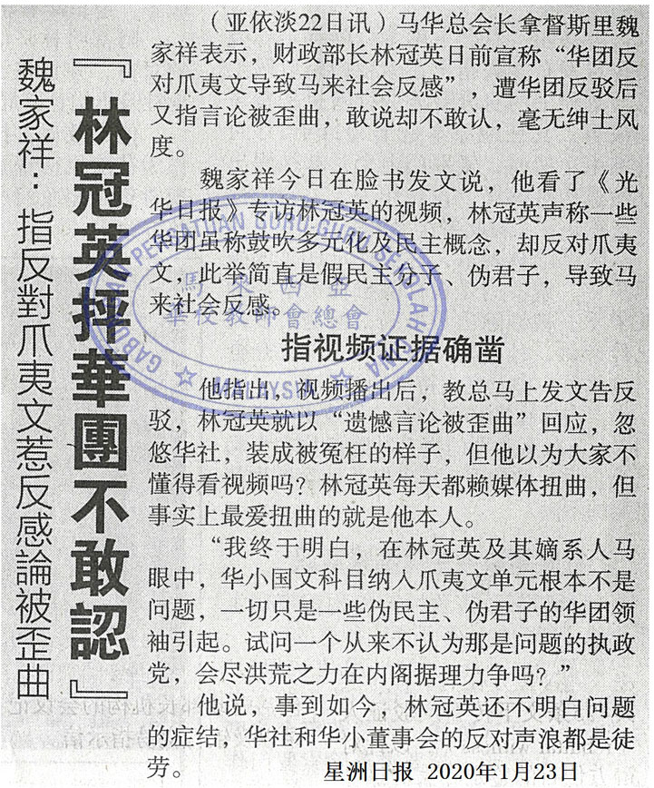 魏家祥:指反对爪夷文惹反感论被歪曲 “林冠英抨华团不敢认” WhatsApp 上一篇文章: 645临教2月派校 张念群:华小仍缺243师资 上一页 下一篇文章: 华小缺逾千师资 教总促教部速拟应急方案 下一页