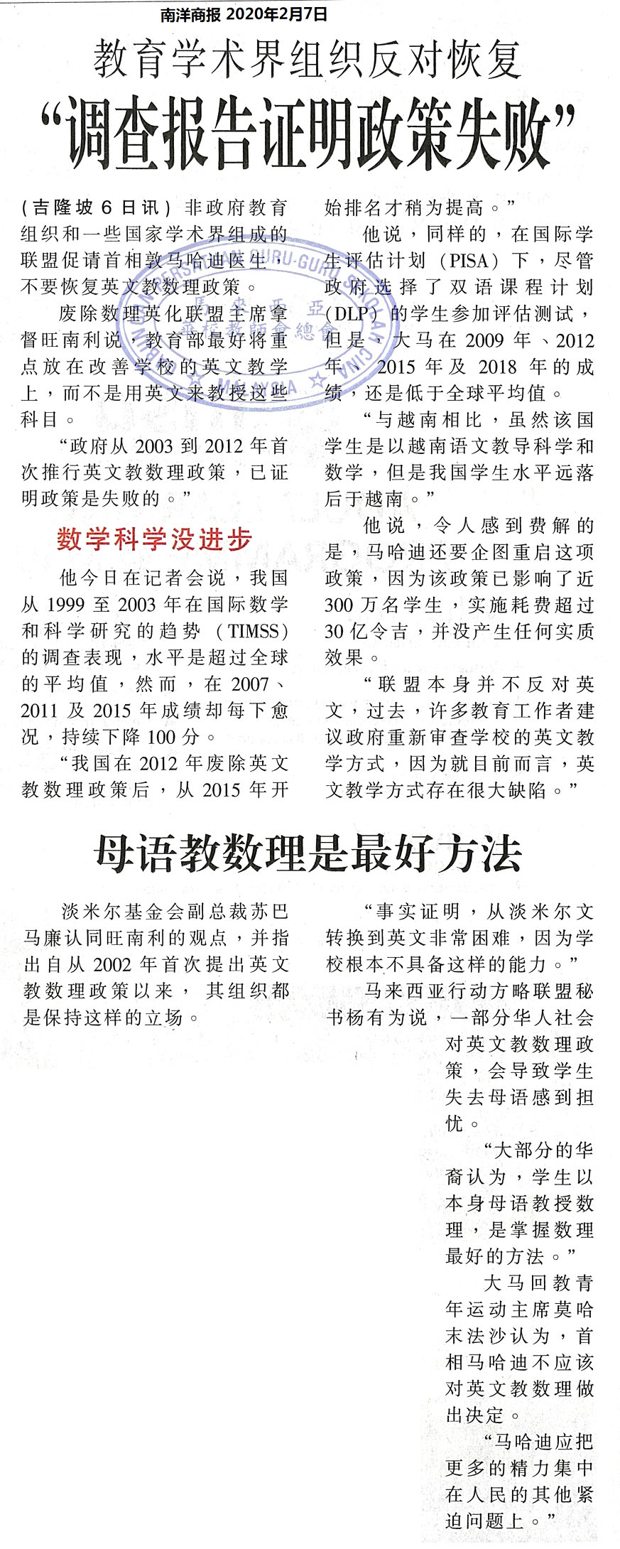 教育学术界组织反对恢复 “调查报告证明政策失败”